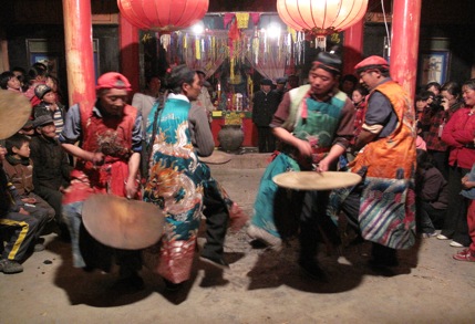 二、“打坛”中, 觋公四至六名以上多者不限,双手各持一只羊皮鼓载唱“答谢天地”、”设起坛”、”香山卷”,歇缓中在香炉上烘烤羊皮鼓,以便更加响亮。跳“刀令曲”时(刺破觋公上臂内侧静脉,让鲜血沿臂面下流通过手掌,如能从中指下滴则为“通路“,预示年运亨通,百事如意。约持续一小时。“开五门”以祭五方为主要形式( 东方麒麟、南方凤凰、西方张广、北方玉堂、中央总五门),说法为:“上有一二三四五,下有金木水火土,人有生老病死苦”。起先觋公们并排面朝神像站到佛堂内敲着羊皮鼓唱念祈祷一番,而后由“水头”用香火引出至佛堂外,围着火堆载唱藏汉语混合的各种曲调,富有节奏,流畅婉转。左手持羊皮鼓,右手拿木槌,有时四人面对面载唱,再跳成双排,交错几次或原地翻转。 结束部分“拜五方”:庙官在庙门前摆一张大红供桌:献一杯酒一杯茶,桌两侧将羊皮鼓头朝上立着放,将“红”(大红色绸段)平搧在羊皮鼓上面,由水头带领觋公们“拜五方”,而后将“红”撕成一寸宽的长条,分给众人挂在肩头或系在脖子上,以示吉利称为挂红。这项仪式以“封酒”盖酒瓶结束。从即日起做佛事的人不能喝酒,直到佛事结束。