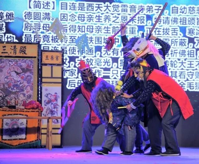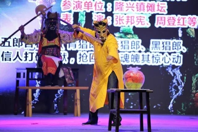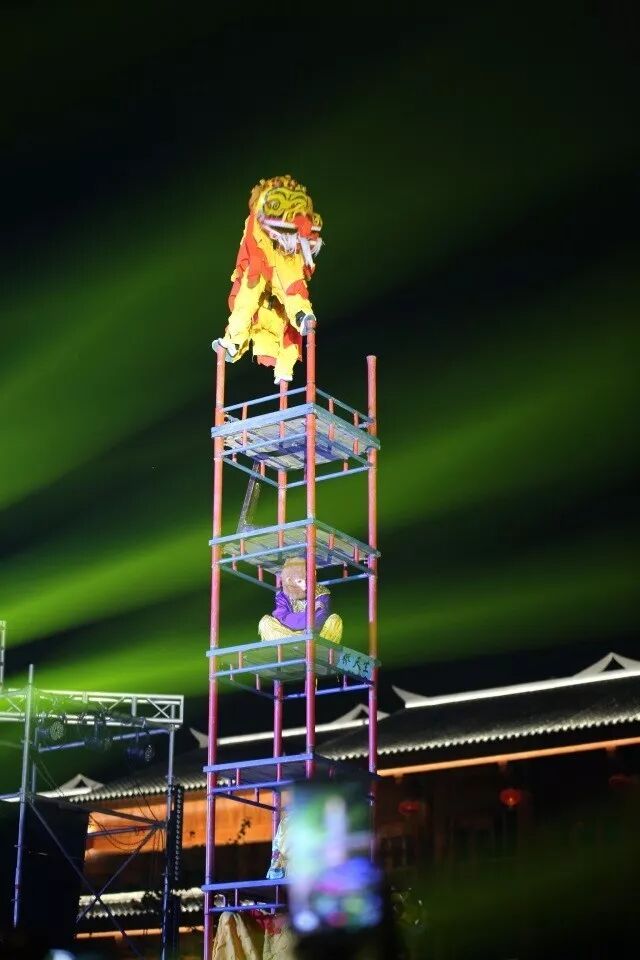 “破盆”《目连戏》则是道真独具特色的目连戏演出,在当晚演出中,与当地的民俗杂技高台舞狮进行了融合改编。