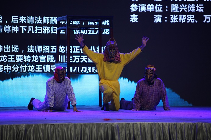 《骑龙下海》这场傩戏展示了傩戏面具的丰富艺术特色,在常见的傩戏面具之外,还出现虾蟹、龙王等兽化面具,各具特点,个别面具还具有口眼可动的精巧结构。