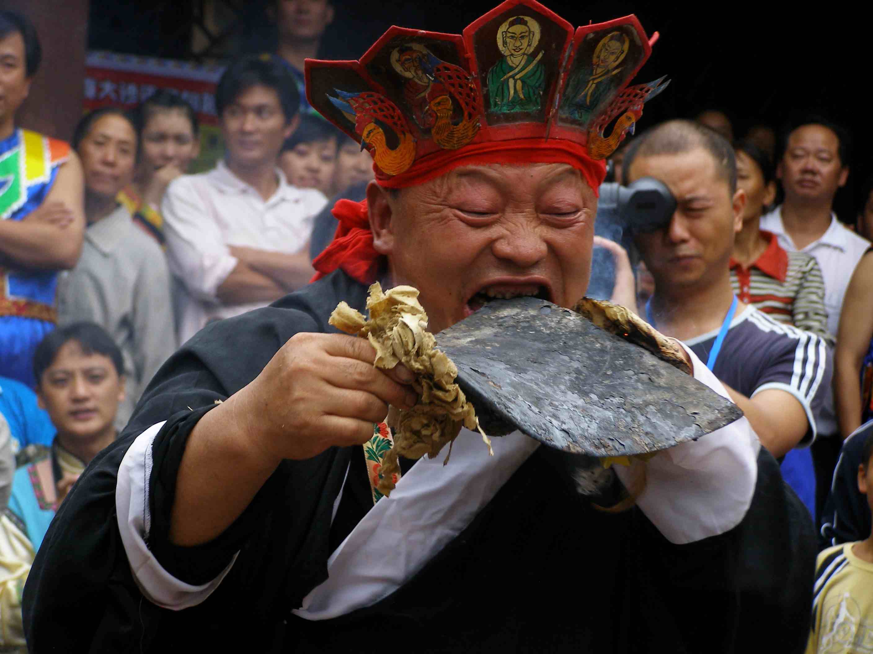 2009年“走进神秘仡乡,感受原始道真”旅游推介活动中的傩技“靸铧”表演(冉文玉摄)