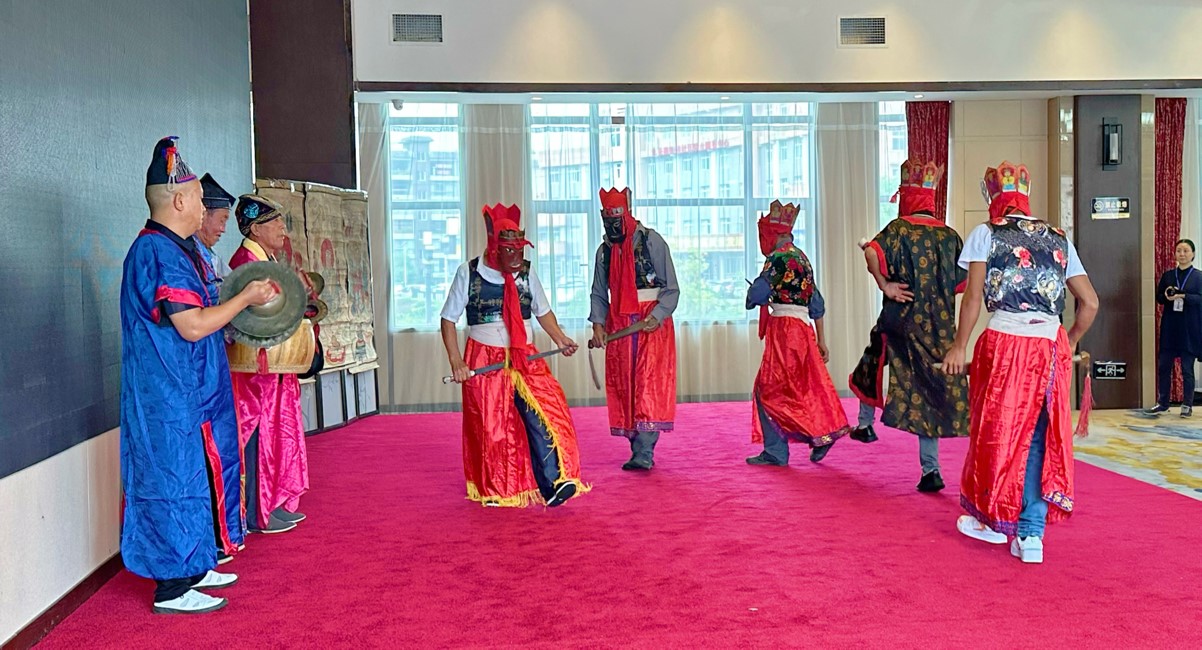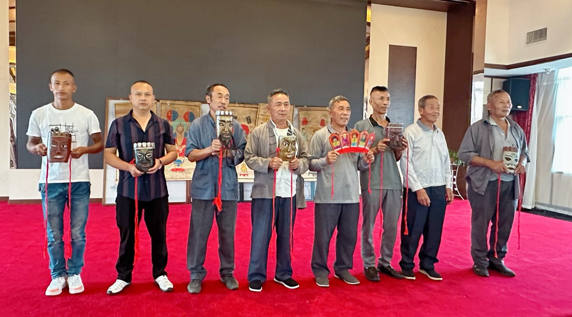 随后,与会领导专家共同合影留念,并于会场观看了“还五显”傩戏表演。表演结束后,当地傩师向现场专家学者展示了“土地”“千岁”“监牲”“华王”等“还五显”面具,以及“显聪”“显明”“显正”“显直”“显德”五显神像。掌坛师杜德良先生与在场专家学者就“还五显”傩戏的面具、人物角色及故事情节进行了交流讨论。
