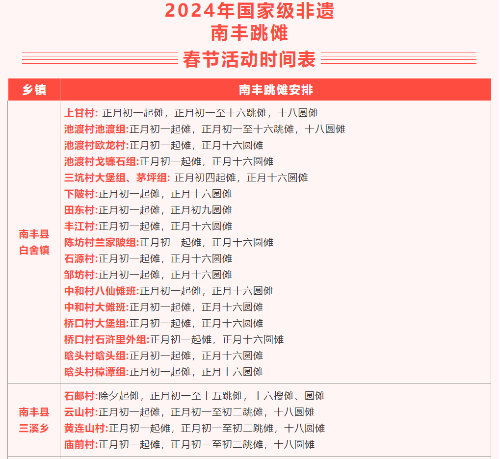 南丰跳傩的保护单位——南丰跳傩研究保护中心,收集、整理了8个乡镇28个村在春节期间的傩事活动日程,编制成详细的日程表,由南丰县文广新旅局的公众号“南丰文旅”发布如下:
