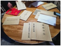 3月1日下午,杨村傩戏传承人杨润方先生等陪同考察团分别走访了傩戏老艺人王旭普和王元功先生,座谈傩戏保护传承的现状。王元功先生是杨润方的授业恩师,已年逾古稀,珍藏着一批绘制或抄录于明清时代的神案和傩戏文献,但因个人家庭保存条件不善,存在虫蛀、褪颜、受潮、残破等现象。考察团在现场即时指导陪同人员应该如何保护、认识、收集、整理以及利用这批文献。后又到杨村镇文昌宫杨村傩戏传习所,调研现存的主要傩戏文献和面具。