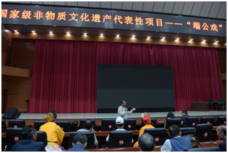 王勇以《遗世奇珍、文化瑰宝──昭通端公戏保护传承和发展的当代思考》为题进行讲授。分别就昭通端公戏的历史渊源、传承发展、表演形态、存在问题和发展建议进行了详细讲解。王勇认为,昭通端公戏具有“外生土长”的特点,是随着历史上汉族移民的足迹传到昭通,呈现出来源广泛、多元并存状态。