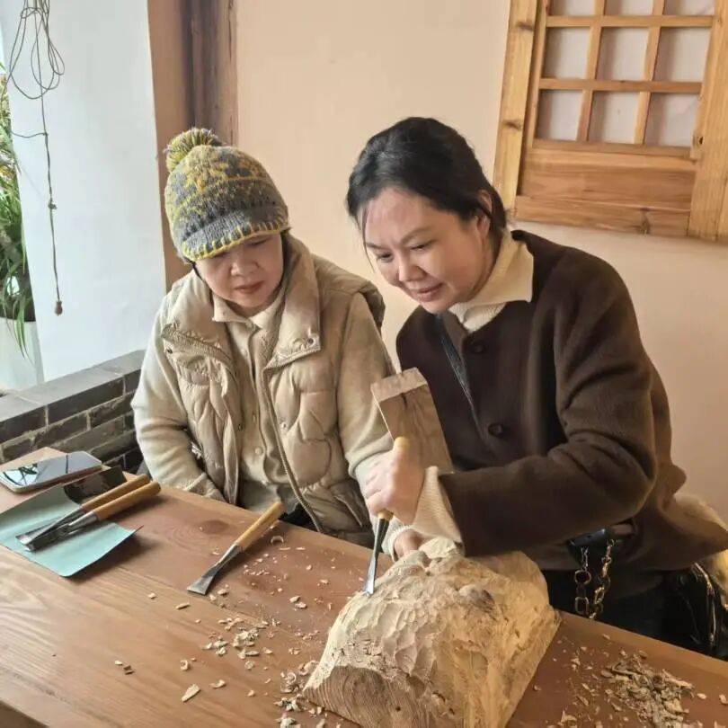 在面具雕刻工作室内,黄老师拿出了邵武傩舞中最具代表性的开路神和弥勒面具,前者是邵武众多傩舞节目中的前导,负责驱妖赶鬼,敲锏开道;后者常出现在邵武傩舞《跳番僧》中,叶明生等学者认为体现了当地傩舞的弥勒信仰。同学们争相戴上傩舞面具,并在雕刻师黄美凤老师手把手的指导下,兴致勃勃体验了傩舞面具的传统雕工。