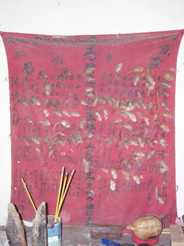 傩坛艺人每次受人之请,外出做完一堂法事,回来必须带一只公鸡来敬师,用鸡冠血点在师坛榜上,还要贴上一片鸡毛,向历代祖师报告法事圆满,望祖师今后护佑弟子,让坛门更加兴旺。