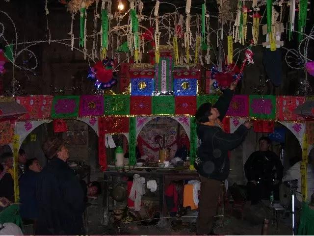 安永柏等表演。祭坛前摆上煮熟的猪肉、羊肉。唱、跳,吹牛角。法师与主人抬着装祭品的茶盘,前后移动。