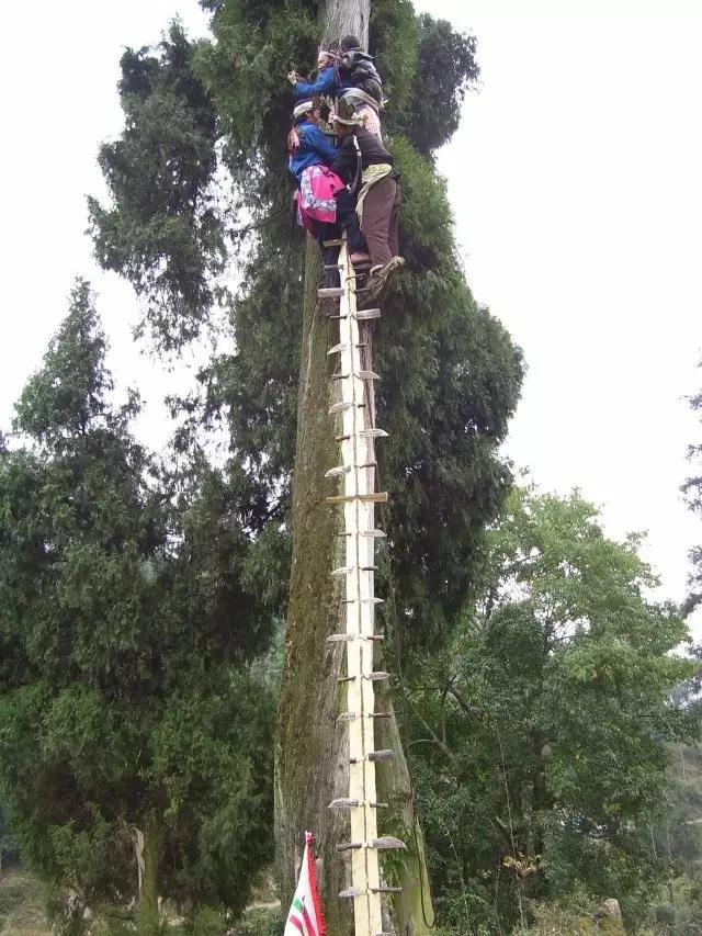 上刀梯前,安永柏先念诵咒词,然后用一根布带将小孩杨海飞背在背上,边念咒词边上刀梯。接着杨秀辉、周全安紧随其后。