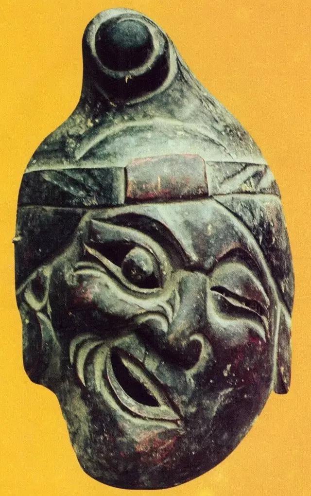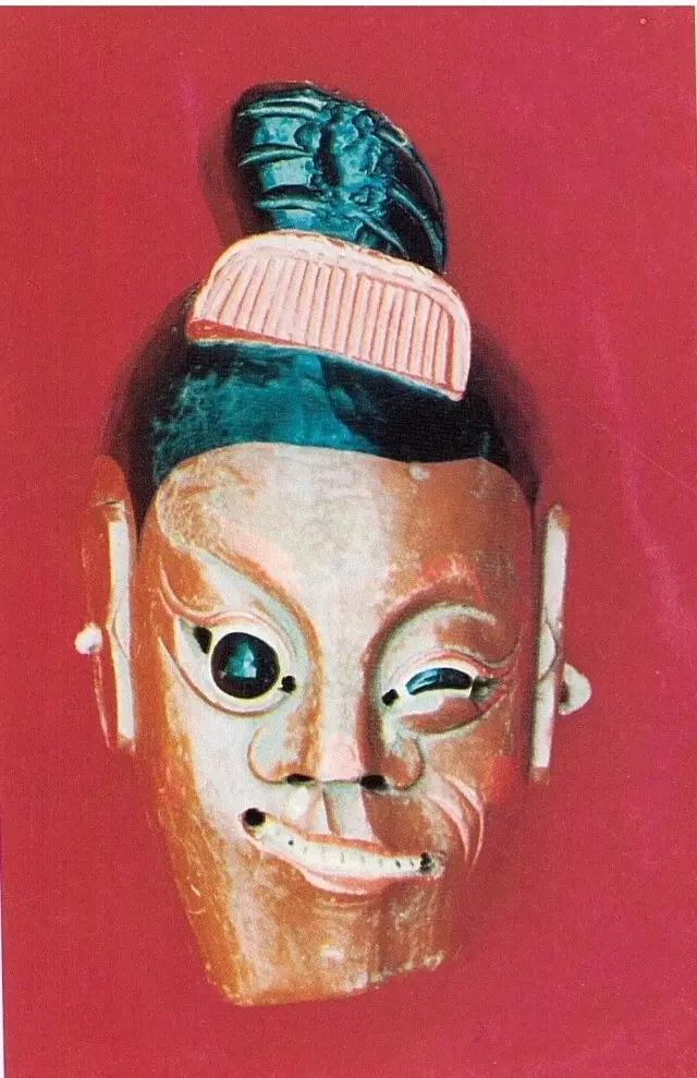其次,来看眼睛的类型。傩戏面具角色的眼睛变例,可以归为半睁半闭、凹陷空洞和暴突伸出三种非正常的眼神。半睁半闭的眼睛,看上去似睡非睡、似醒非醒,目光凝滞,略显神秘,在傩戏面具中往往是正神具有的一种俯瞰世界、掌控人间、显示威权神力的眼神。利用面具质料自然镂空的凹陷空洞的眼睛,它被赋予秉性怪异乖张的一些凶神怪灵。它其实是人类通过神灵附体观看自我、内视心灵的窗口。空洞的眼神里其实贮存着为生命舞蹈、为死亡哭泣、看穿一切虚无的目光,它向后看,回溯并提取过往生活的经验;它向内求、抵达并洞穿灵魂最深处的陷阱。而极力睁大以至暴突、在黑暗中极目远眺而向外伸出的眼睛,它向前看,试图无限接近并探秘未知世界的真相;它向外求,企望把握并省思人与世界共生并存的关系。尤其是空洞的凹陷的眼睛、向外伸出拉长的圆柱形眼睛,不仅在傩戏中出现,而且在更为普遍的文明发生地带,都有类似的示现:凹陷的空洞的眼睛,如日本考古出土的绳文时代贝制面具、土制与木制假面[6];藏于柏林民俗博物馆和温哥华英属哥伦比亚大学人类学博物馆的夸扣特尔人的皂诺克瓦面具[7]。