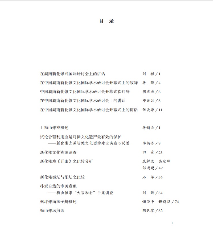 中国傩戏学研究会策划出版的“中国傩俗礼仪文化丛书”,已相继出版了《潮声集》、《土家文化艺术》、《傩苑》、《江西南丰傩文化》(上下册)、《赛社与乐户论集》(上下册)、《舞岳傩神》、《古傩新论》、《祭祀与傩——中国贵州“撮泰吉”学术研讨会论文集》(上下册)、《吴风楚韵——中国江苏溧阳傩文化国际学术研讨会论文集》等,2017年11月,又推出了《梅山傩祭——中国湖南新化傩文化国际学术研讨会论文集》一书。
