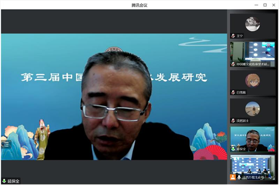 线上第三组点评专家李祥林总结了本组五位学者的发言,认为这五位发言“有的侧重于重新阐释傩的起源,有的梳理地方傩戏的历史,有的就哑剧傩做专题的考察,有的梳理傩戏抄本研究史,有的考察‘浑脱’从生活用具到仪式用具的过程。几位的发言有的侧重于理论思考,有的侧重于田野考察,有的侧重于文献梳理,有的侧重于民俗事象,将这几个方面组合在一起,可以从这几个方面考察傩文化的生态。”
