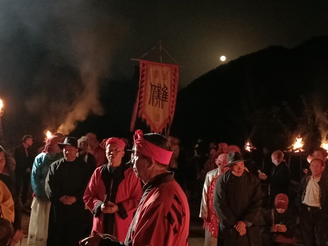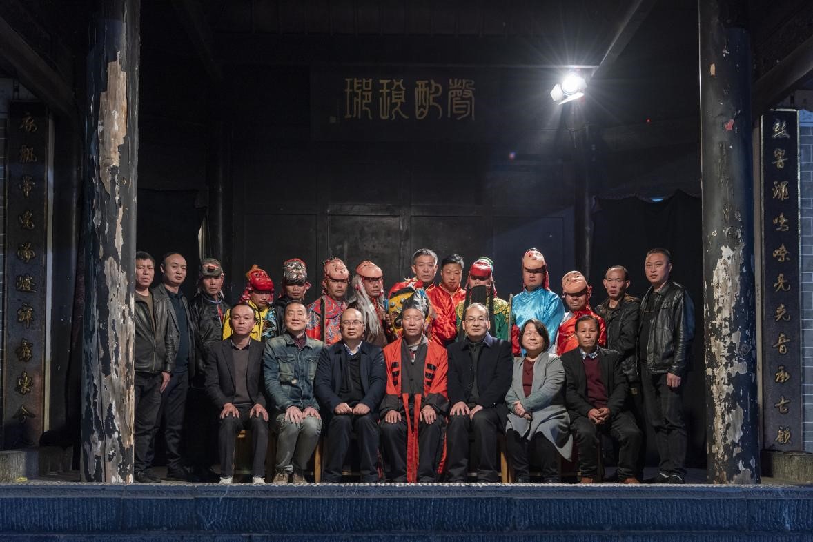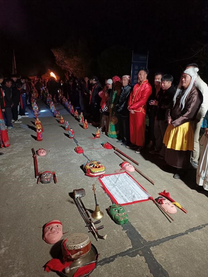 活动从4月8日晨7:08正式开始,共有设坛皈投安位、俱奏申文、开河请水、拦门杀猪祭神、小请神、差兵起马、上脸子、唱摇词、排神上魂、游神参神、下马唱摇词、安兵歇马、行香洒净、拨兵请圣、路桥祭三献九叩礼、造桥畅路、安营寨差三将军拨兵集将、鸣金收兵、团兵、二次团兵、迎神归位、唱摇词、歇马安兵、会兵设宴、迎銮接驾、朝星拜宿、打狮子、造船敕符、串巷收邪、安龙妥土、度孤利幽、功德园满傩神归位等仪程,一直持续到9日下午,晚上则上演傩戏《九神过关》和《走界》。趁演出间隙,我会负责人与傩戏剧团的演职员们合影留念。活动持续到4月10日凌晨2点左右方告落幕。