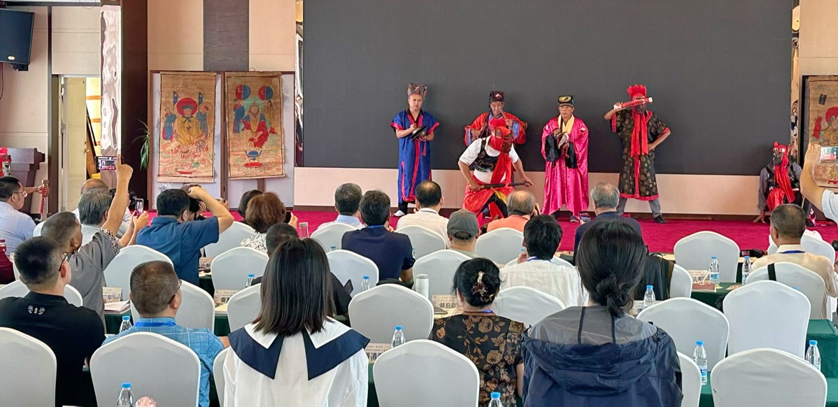 随后,与会领导专家共同合影留念,并于会场观看了“还五显”傩戏表演。表演结束后,当地傩师向现场专家学者展示了“土地”“千岁”“监牲”“华王”等“还五显”面具,以及“显聪”“显明”“显正”“显直”“显德”五显神像。掌坛师杜德良先生与在场专家学者就“还五显”傩戏的面具、人物角色及故事情节进行了交流讨论。