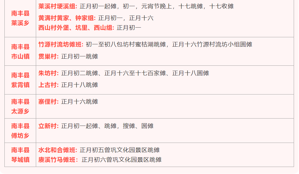 南丰跳傩的保护单位——南丰跳傩研究保护中心,收集、整理了8个乡镇28个村在春节期间的傩事活动日程,编制成详细的日程表,由南丰县文广新旅局的公众号“南丰文旅”发布如下: