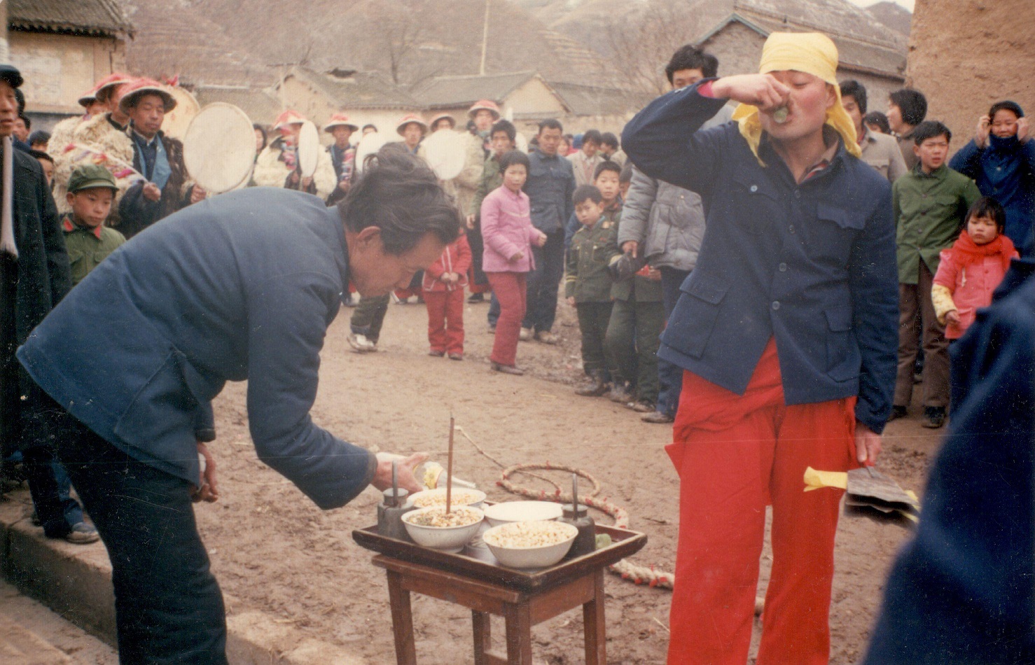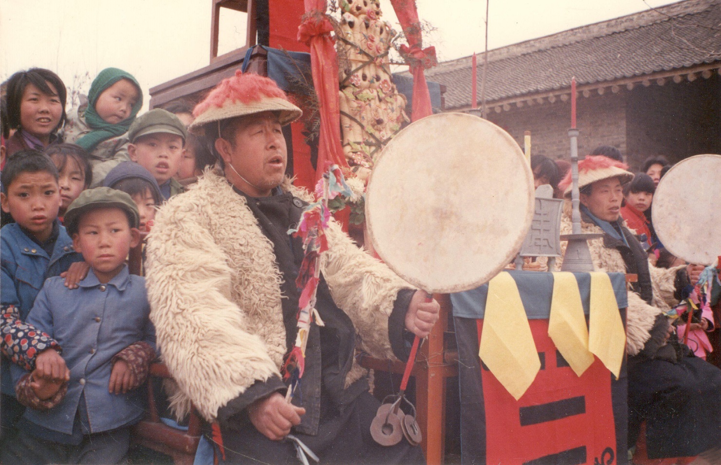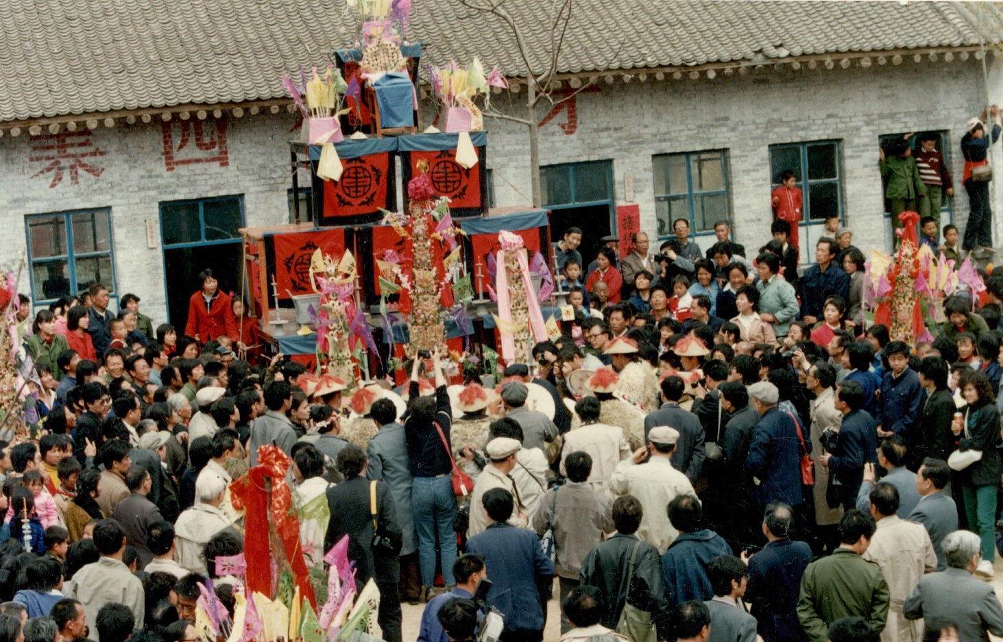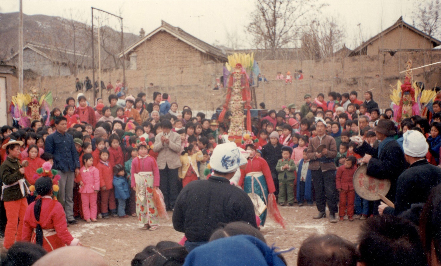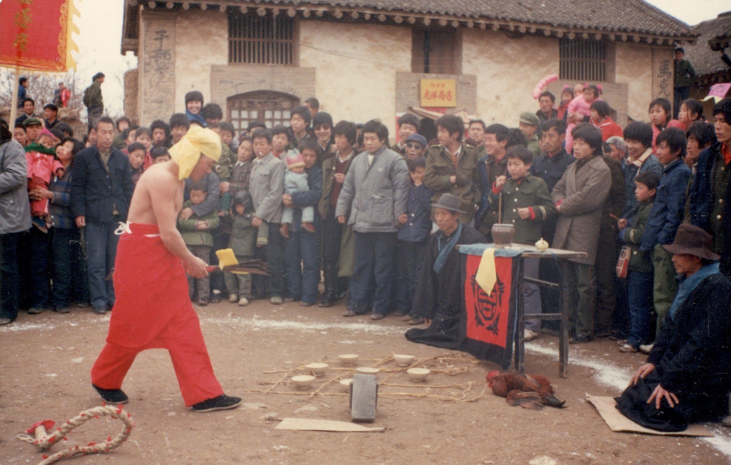 75-1990年 4⽉ 6⽇,任庄村⺠为中国傩戏学国际学术讨论会表演《扇⿎神谱》的盛况(张芳森摄影)