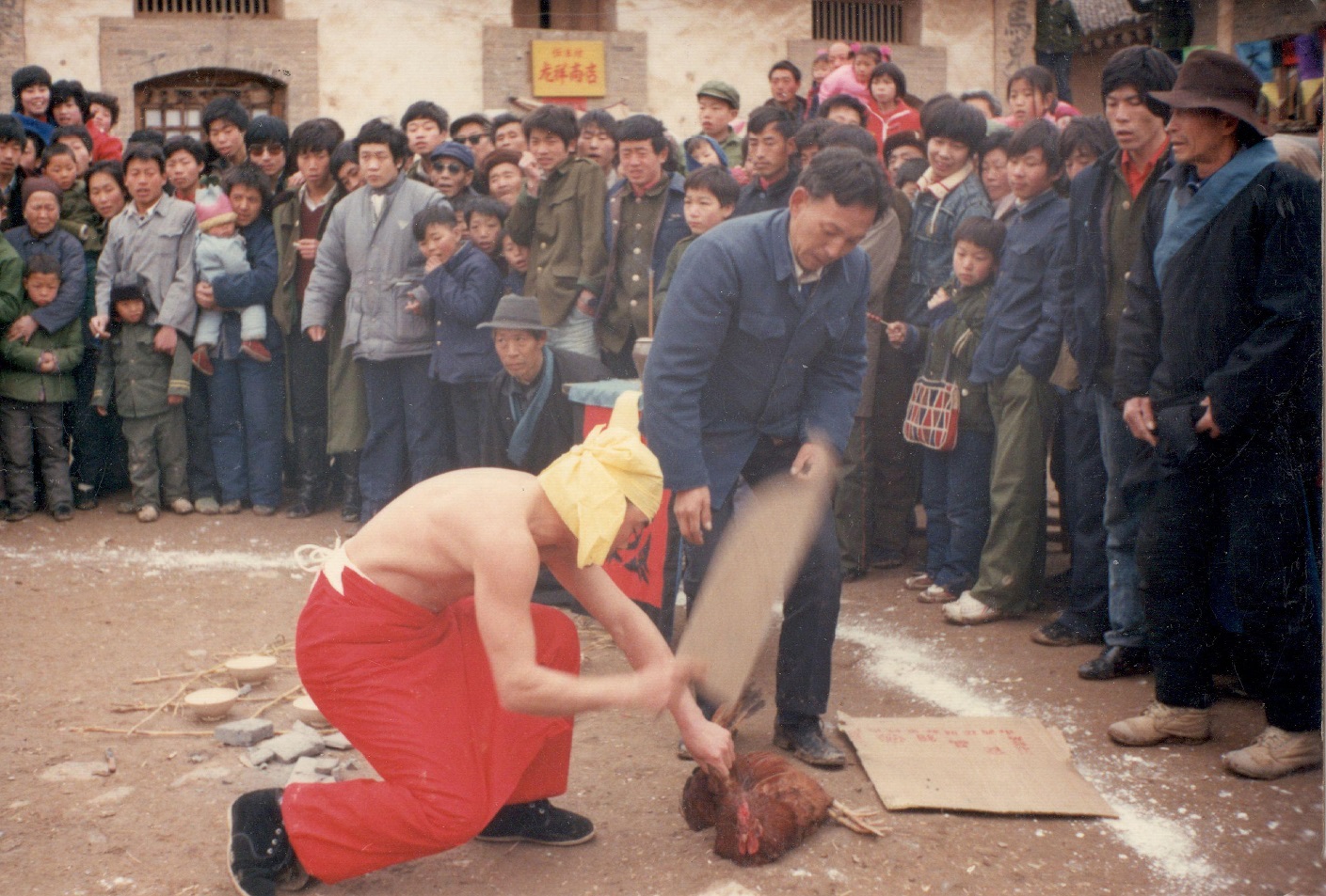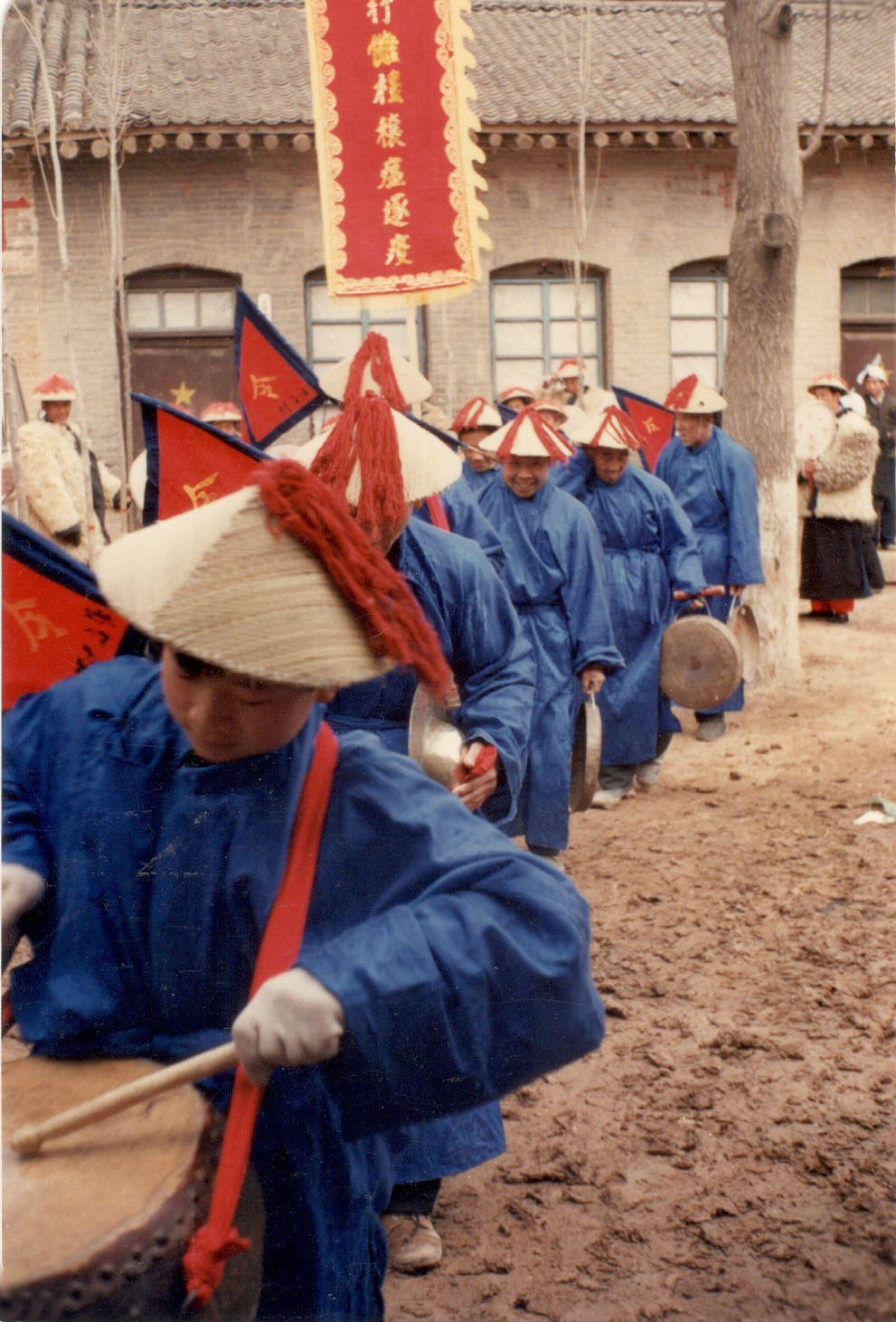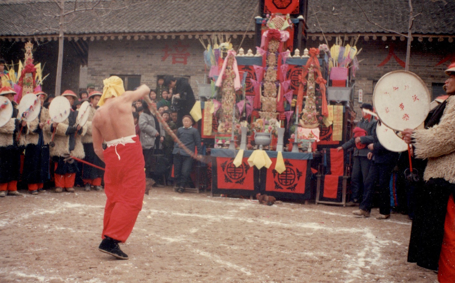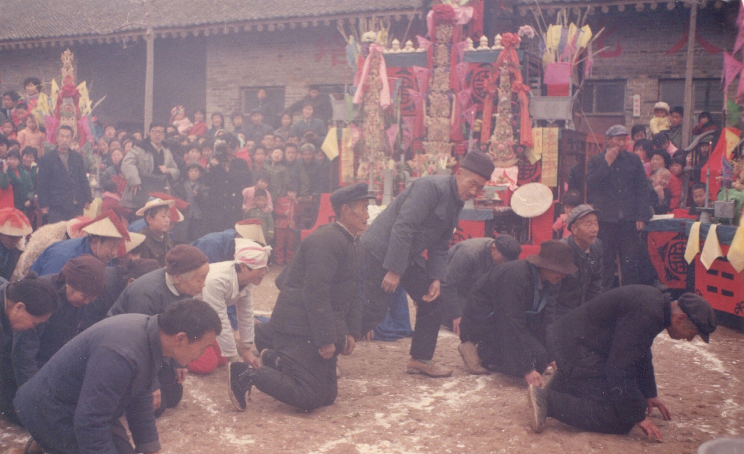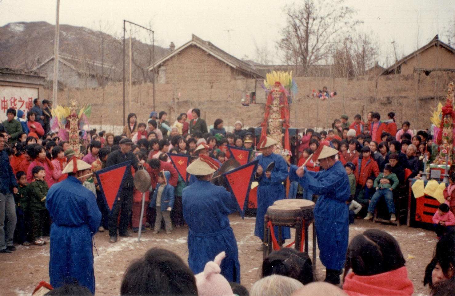 75-1990年 4⽉ 6⽇,任庄村⺠为中国傩戏学国际学术讨论会表演《扇⿎神谱》的盛况(张芳森摄影)