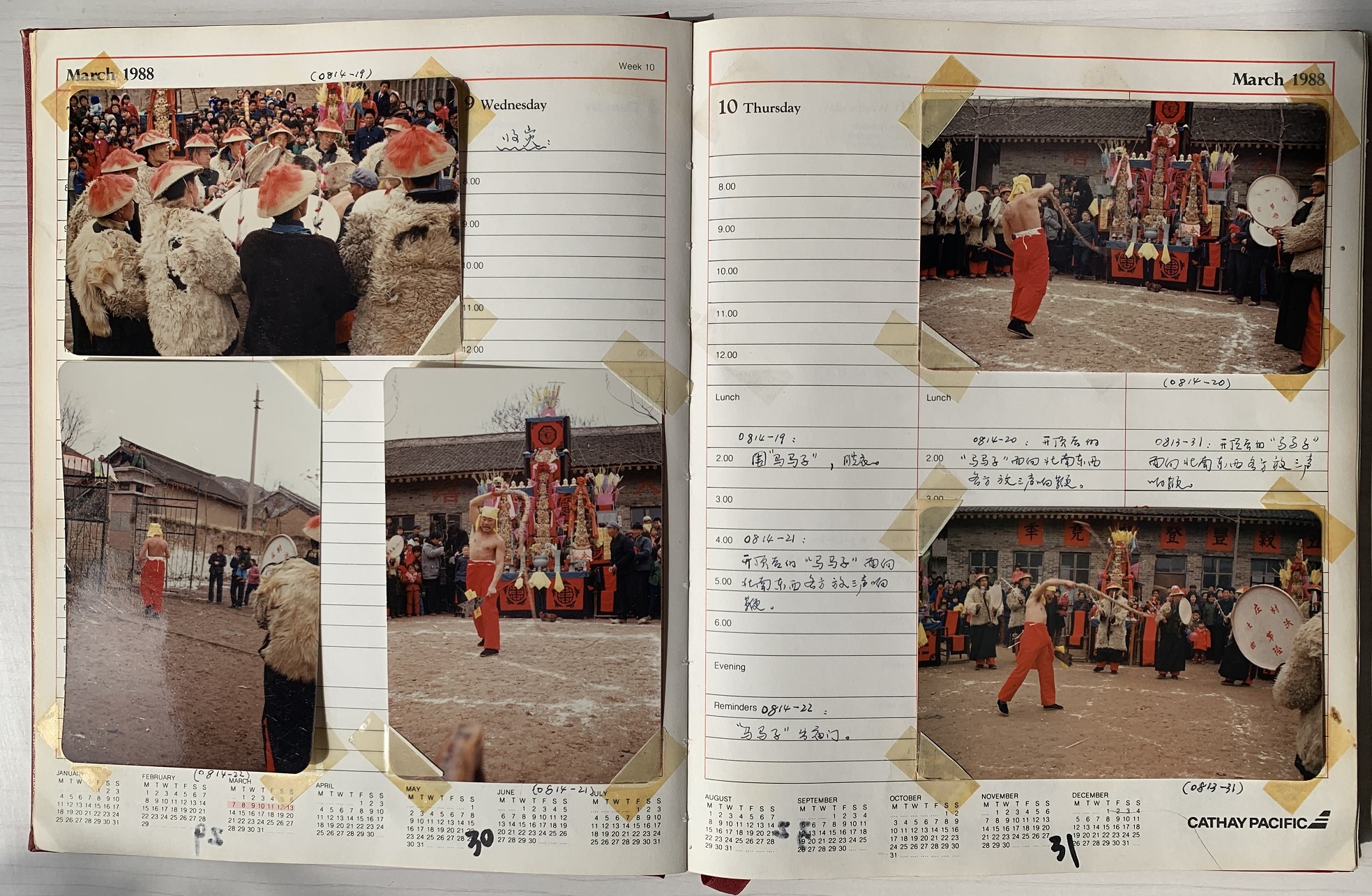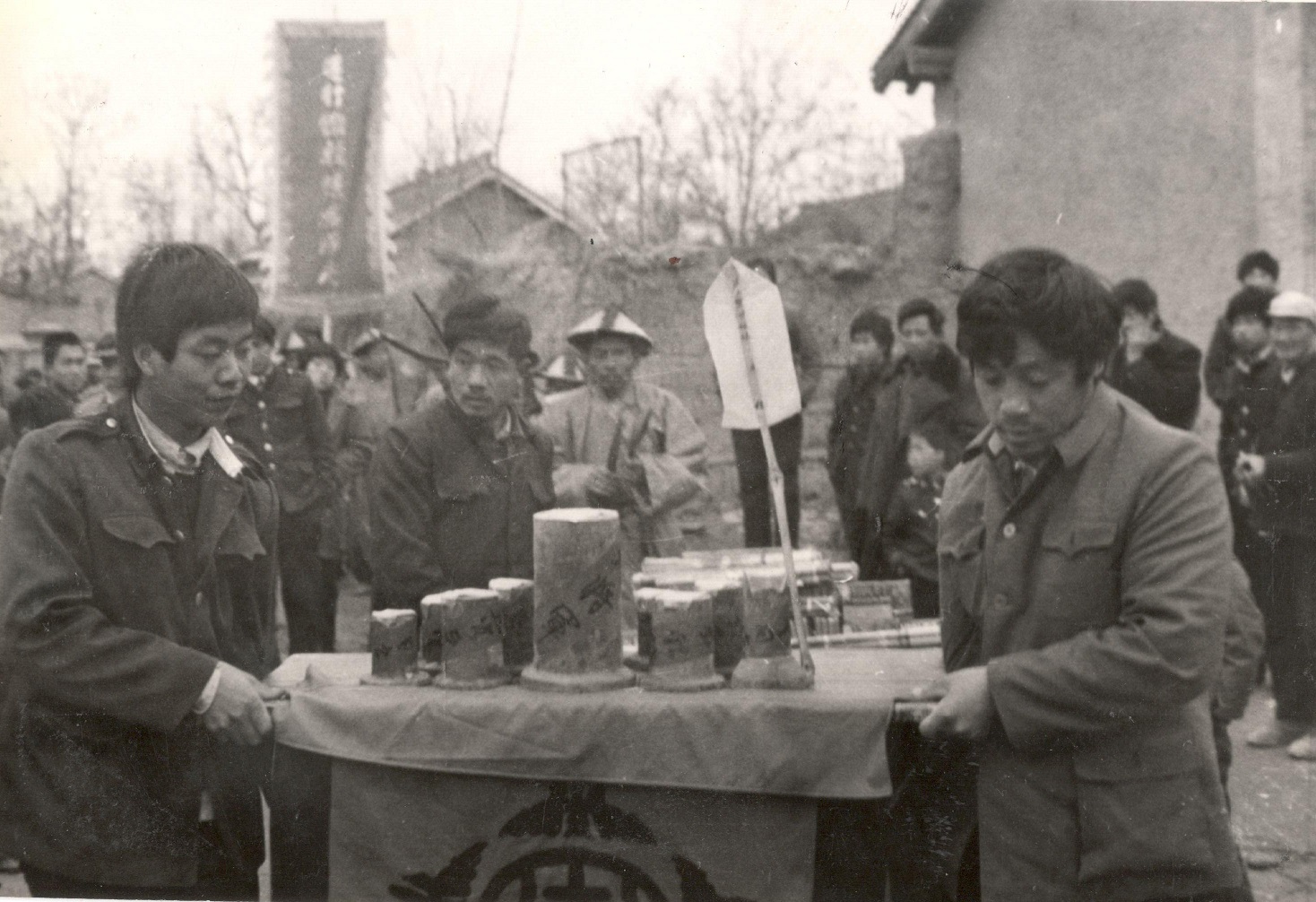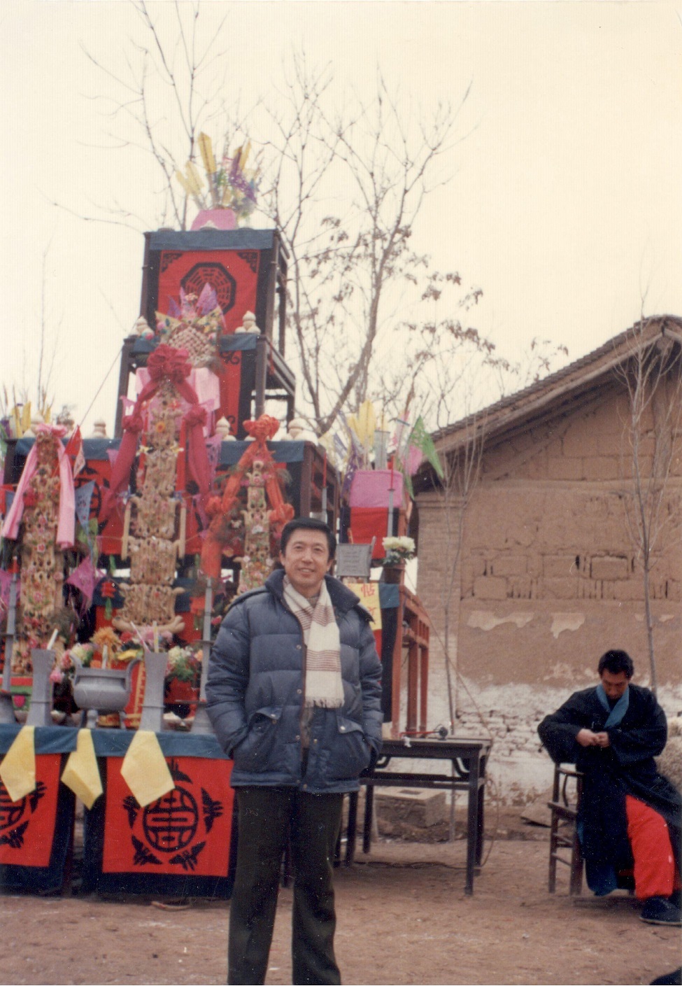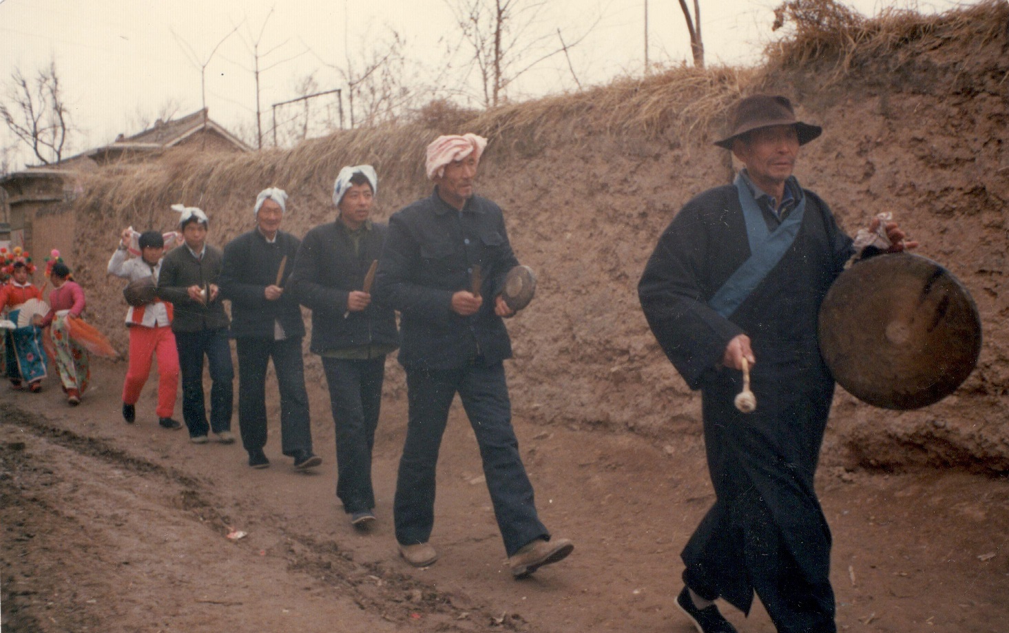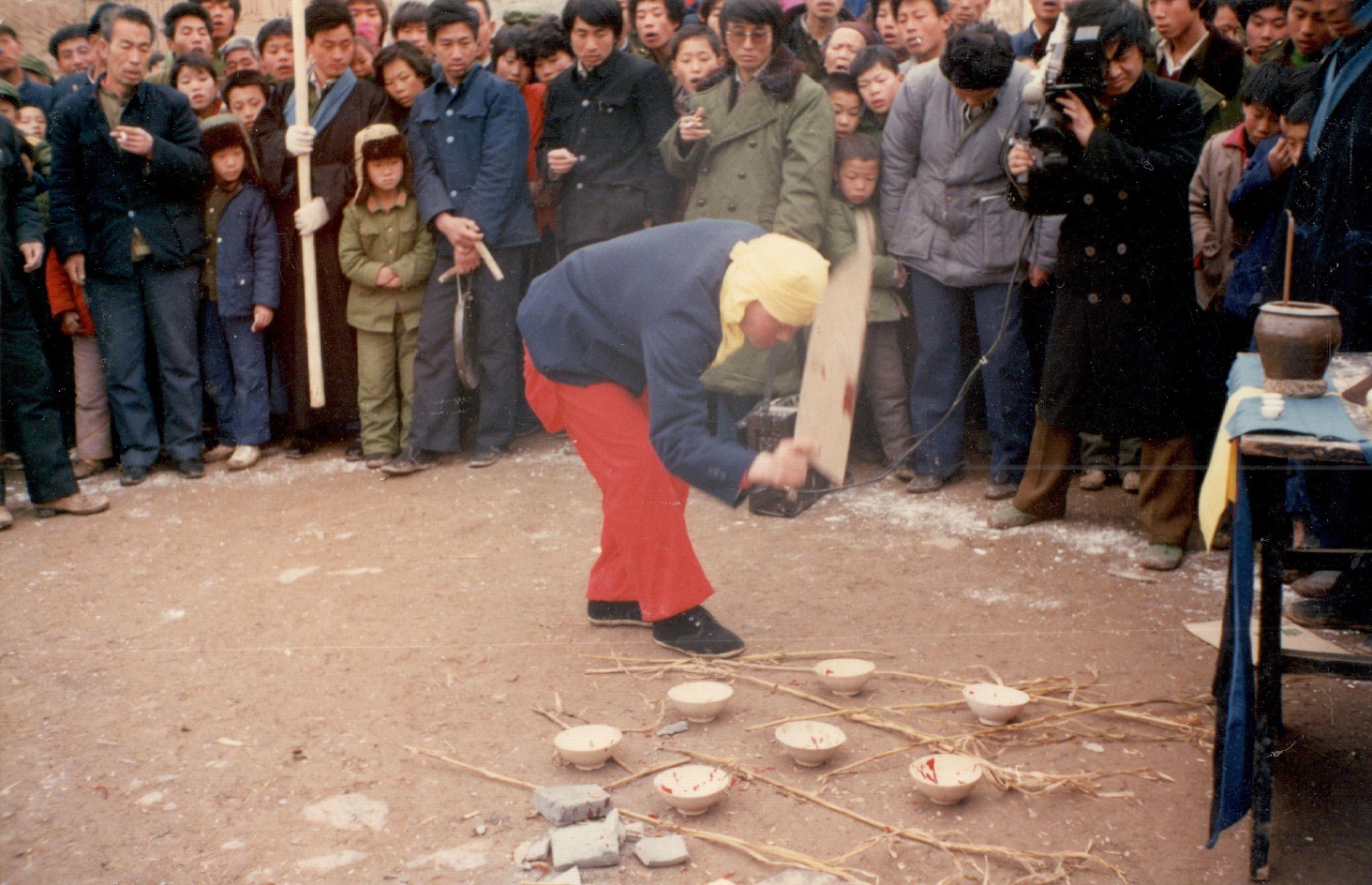 75-1990年 4⽉ 6⽇,任庄村⺠为中国傩戏学国际学术讨论会表演《扇⿎神谱》的盛况(张芳森摄影)