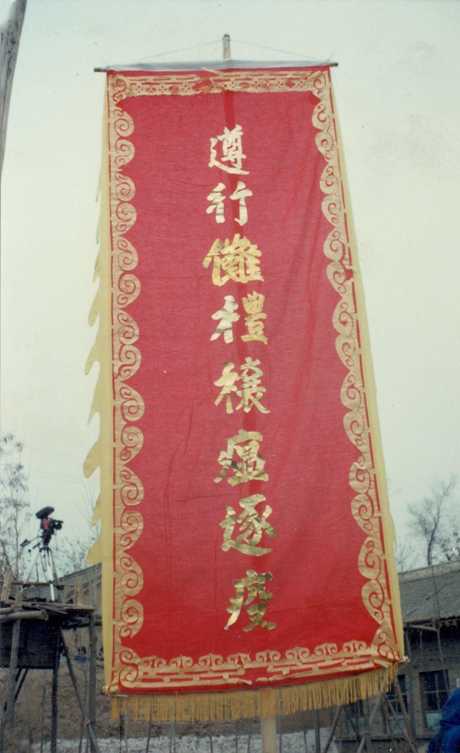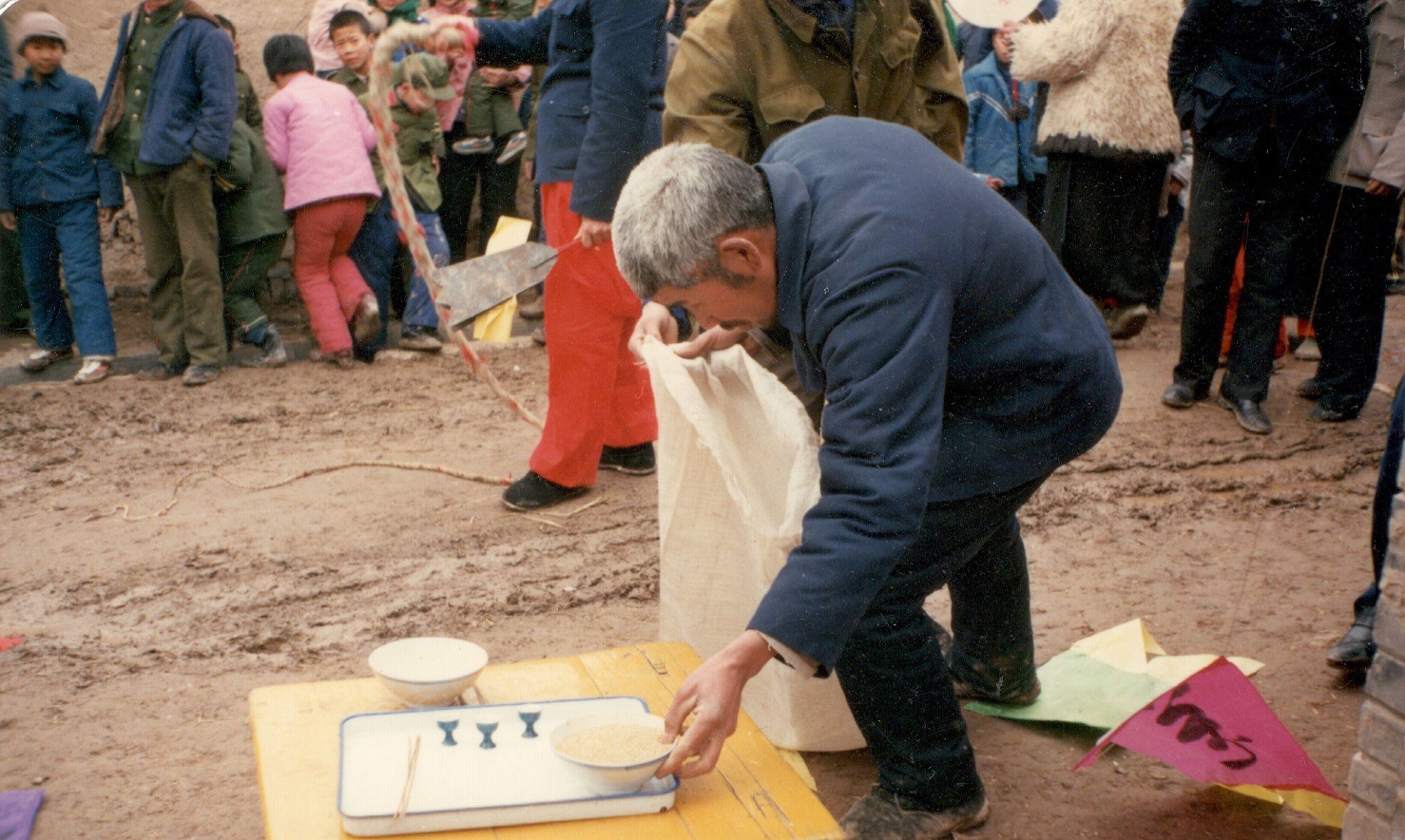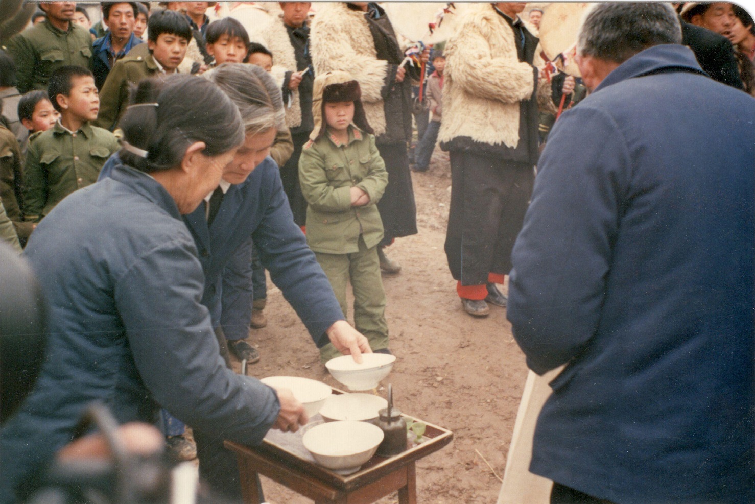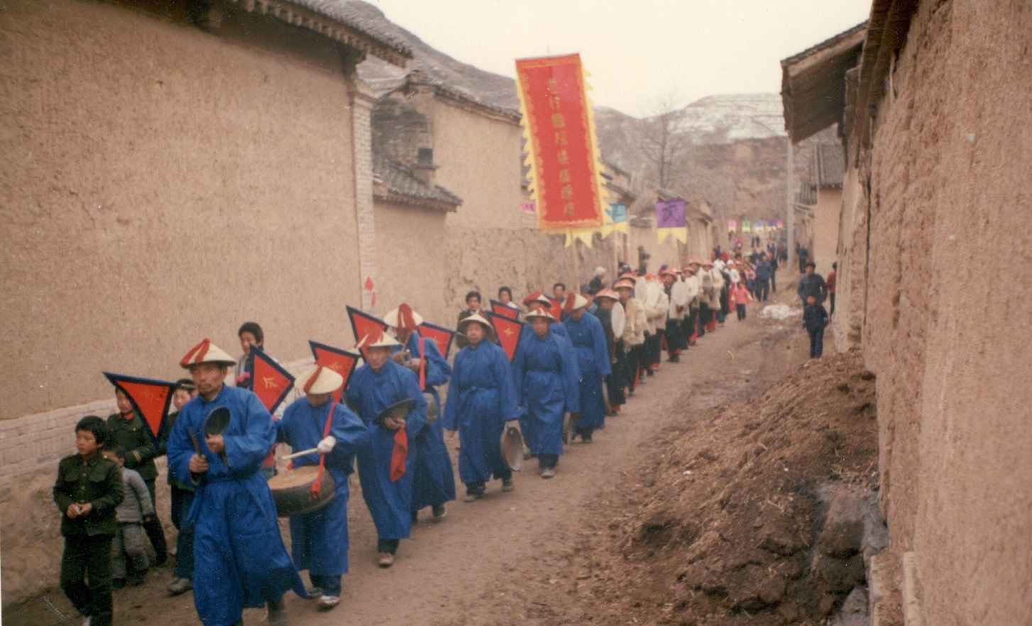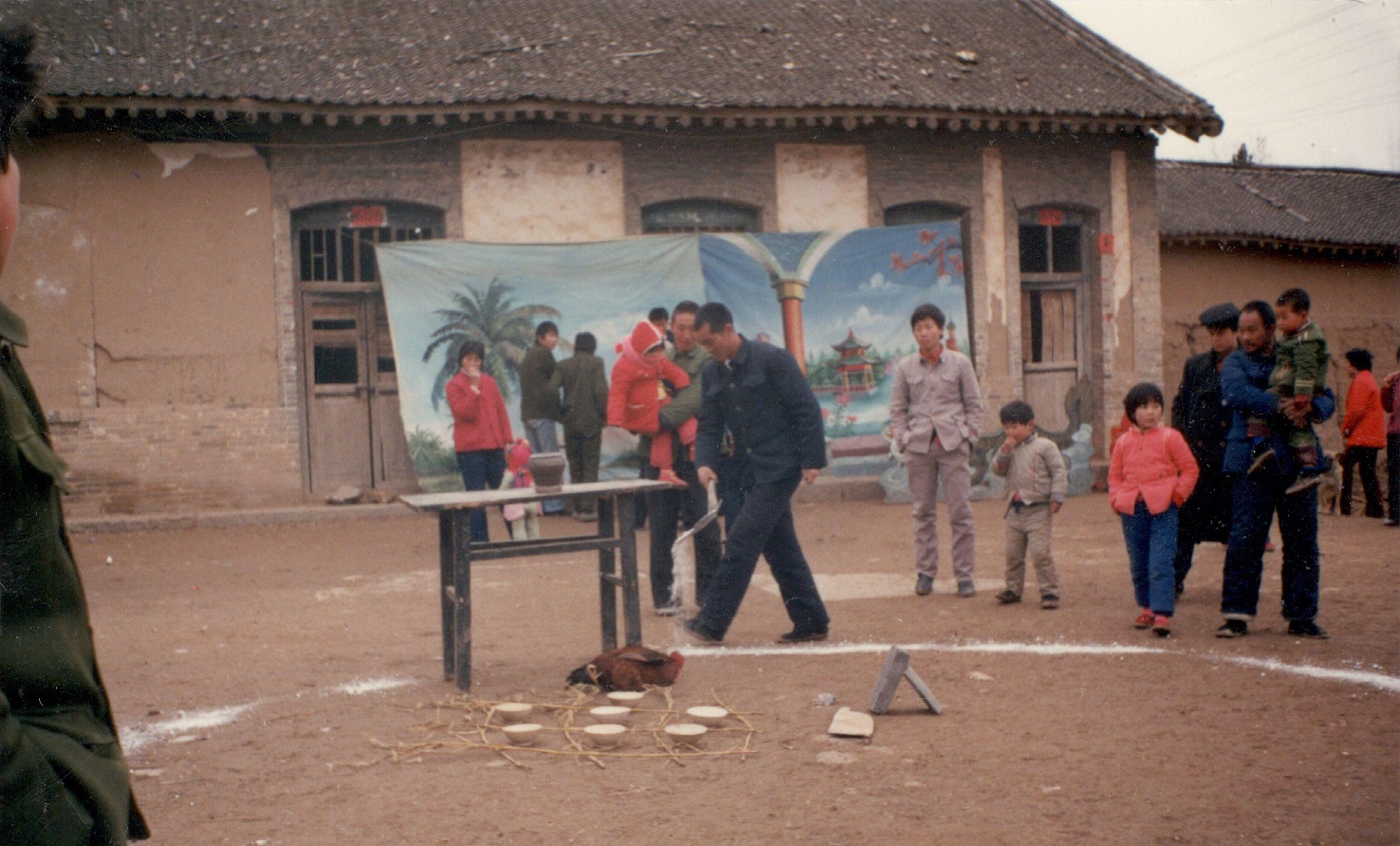 75-1990年 4⽉ 6⽇,任庄村⺠为中国傩戏学国际学术讨论会表演《扇⿎神谱》的盛况(张芳森摄影)