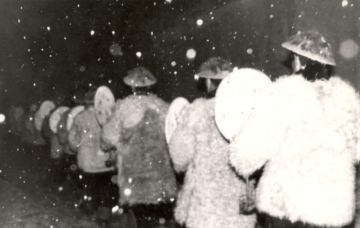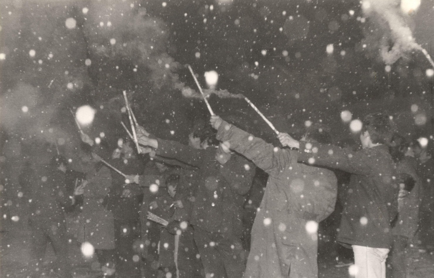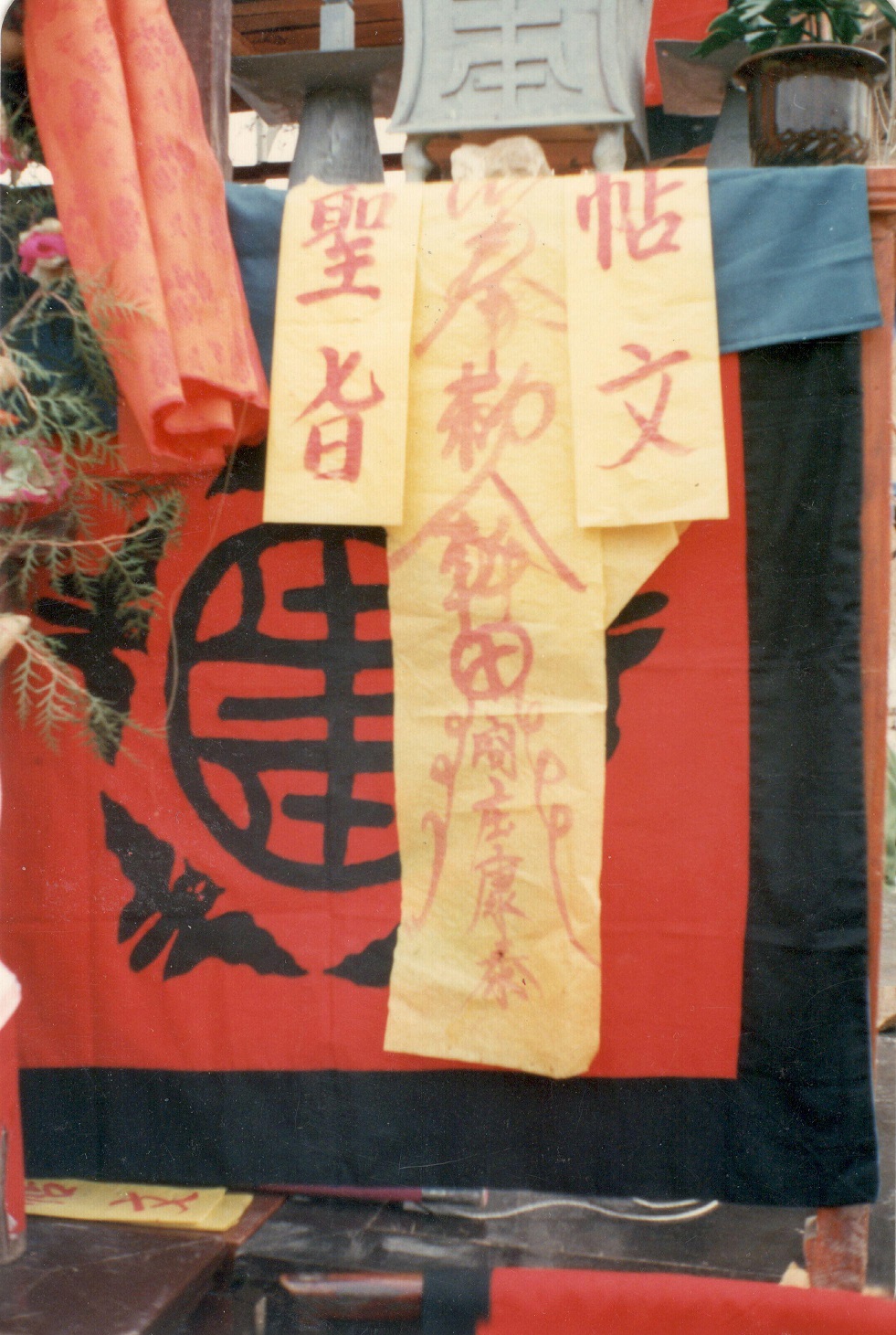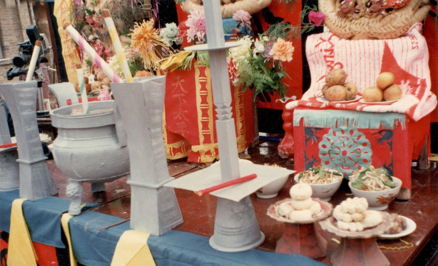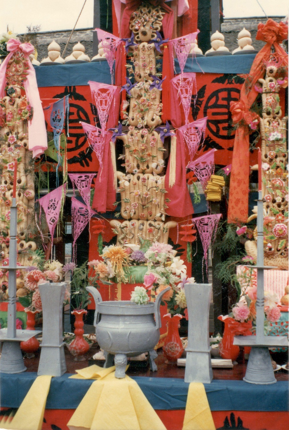 75-1990年 4⽉ 6⽇,任庄村⺠为中国傩戏学国际学术讨论会表演《扇⿎神谱》的盛况(张芳森摄影)