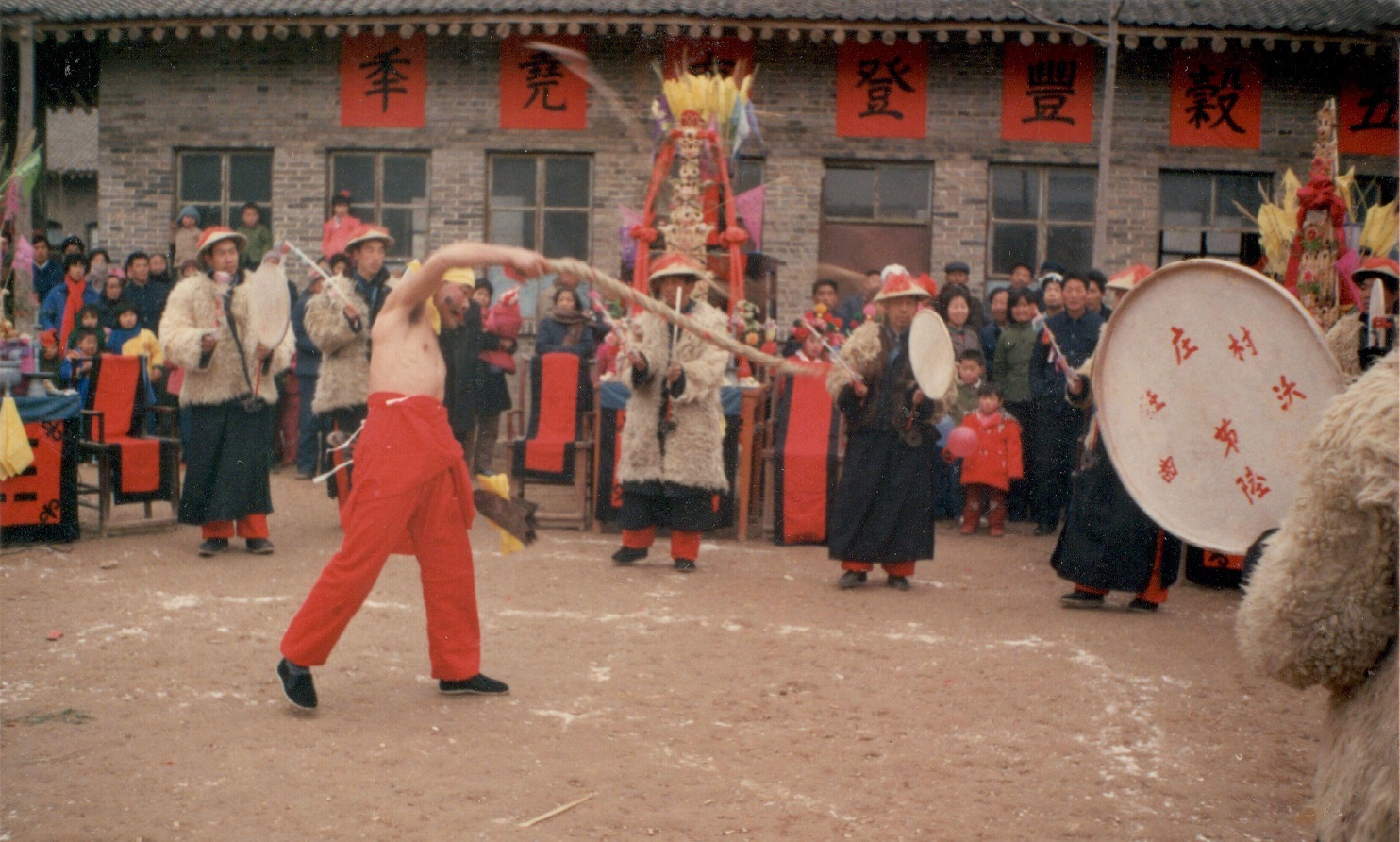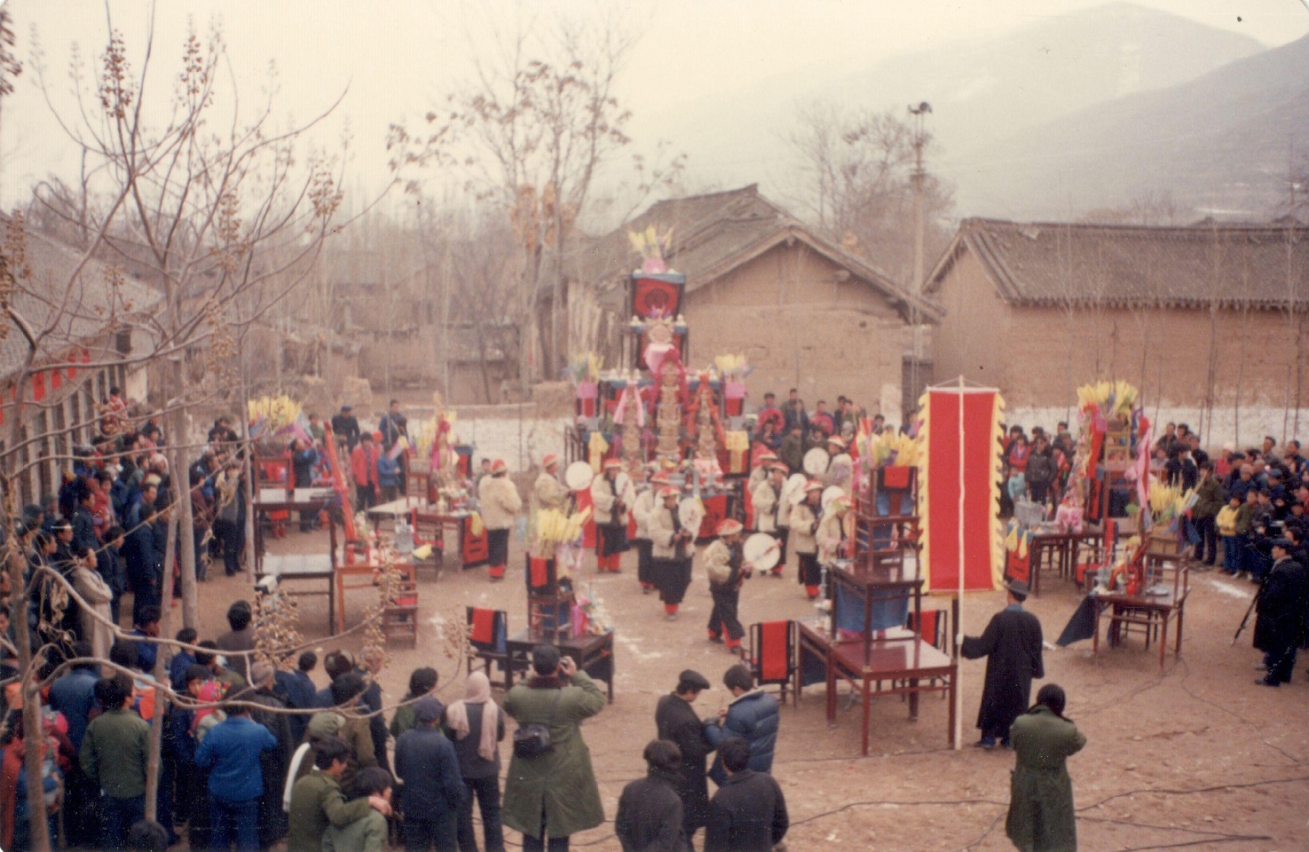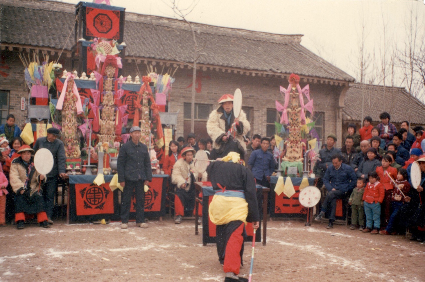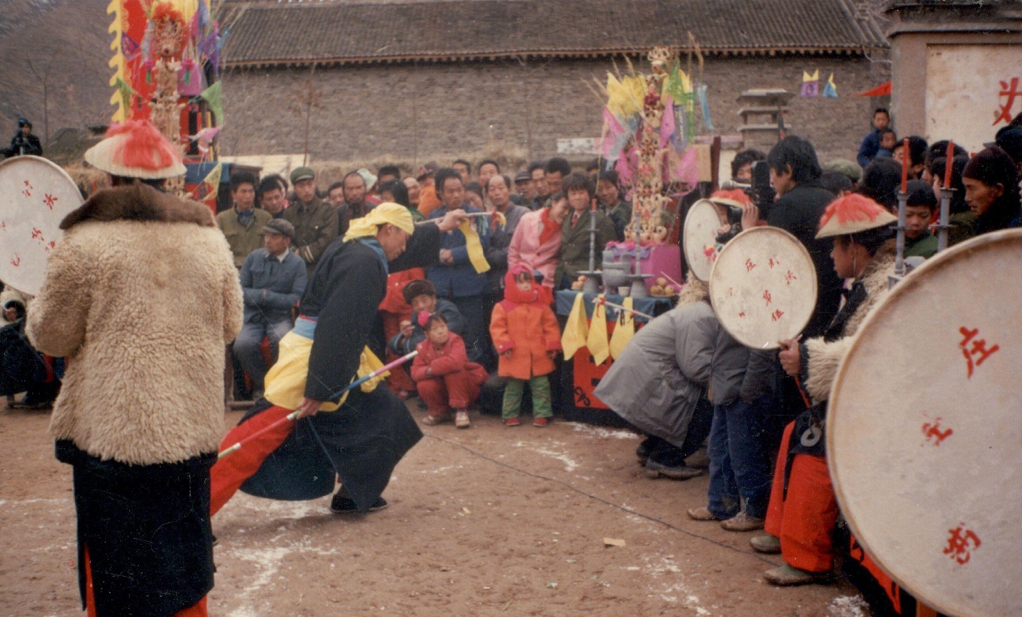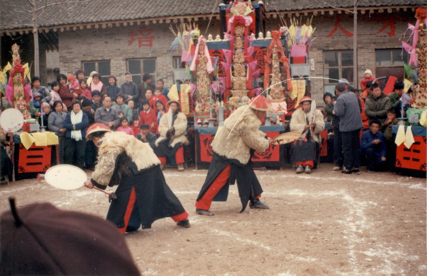 74-1990年 4⽉ 6⽇,任庄村⺠为中国傩戏学国际学术讨论会表演《扇⿎神谱》的盛况(张芳森摄影)