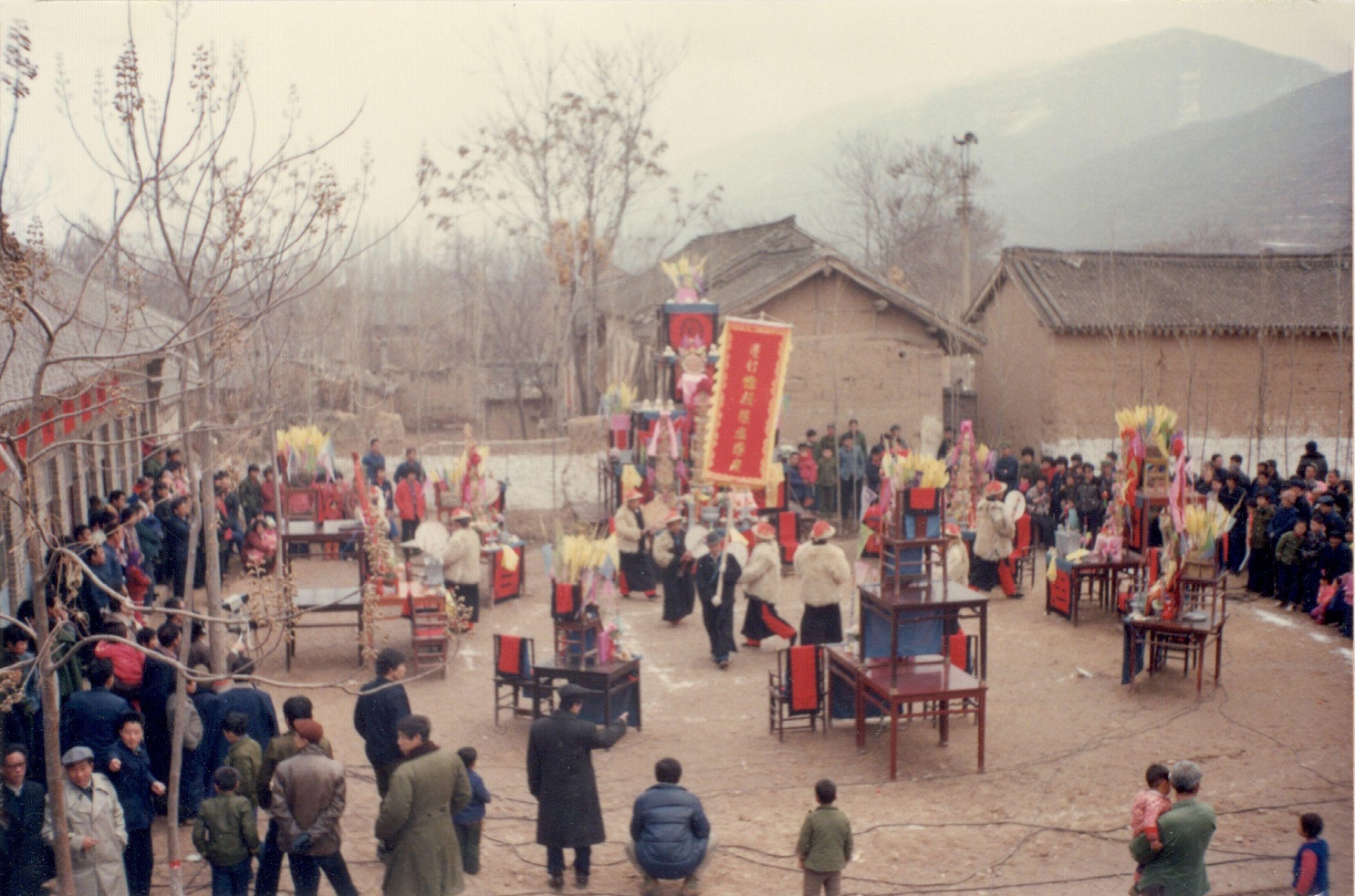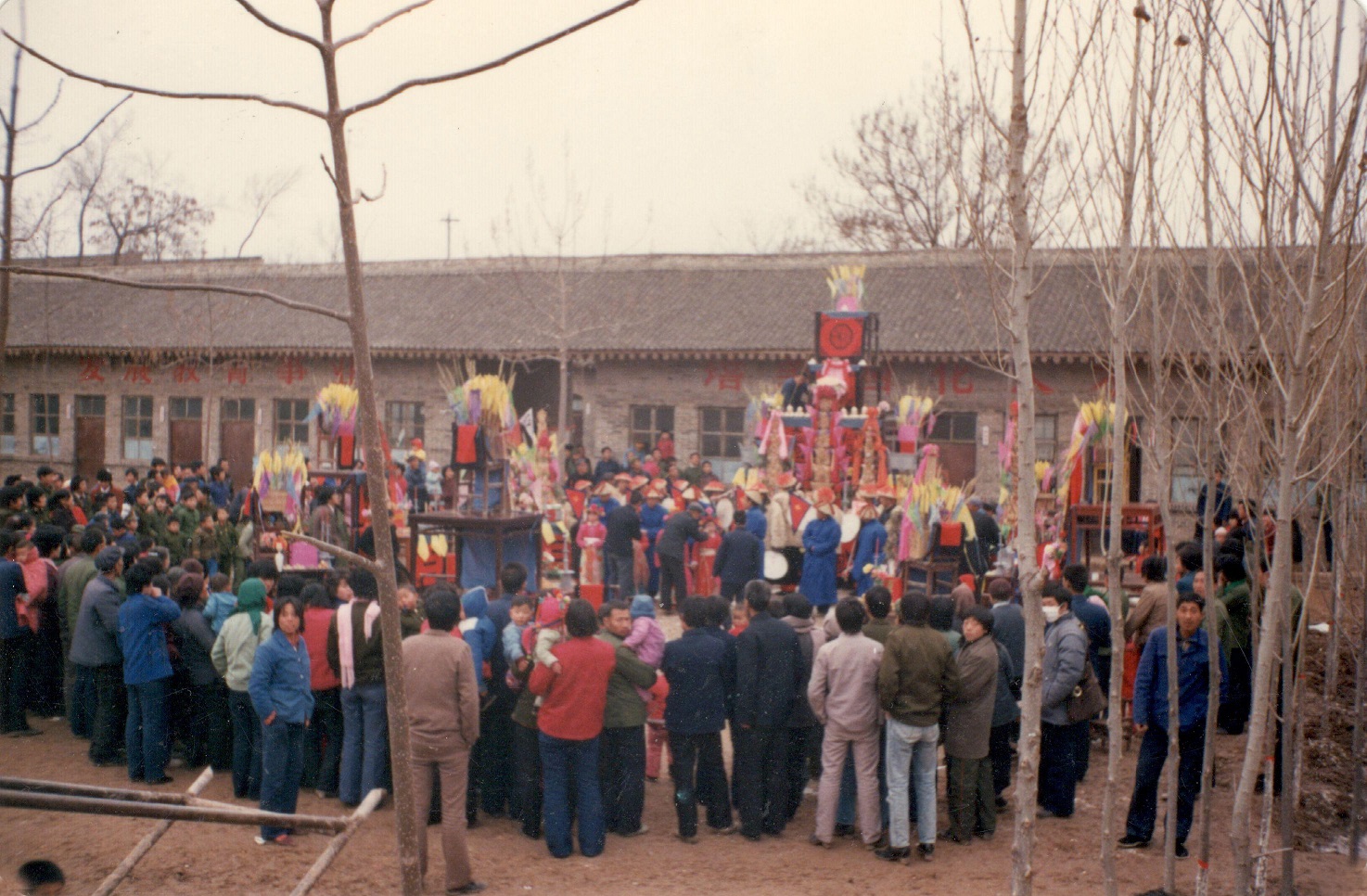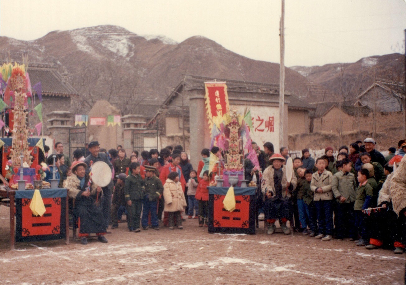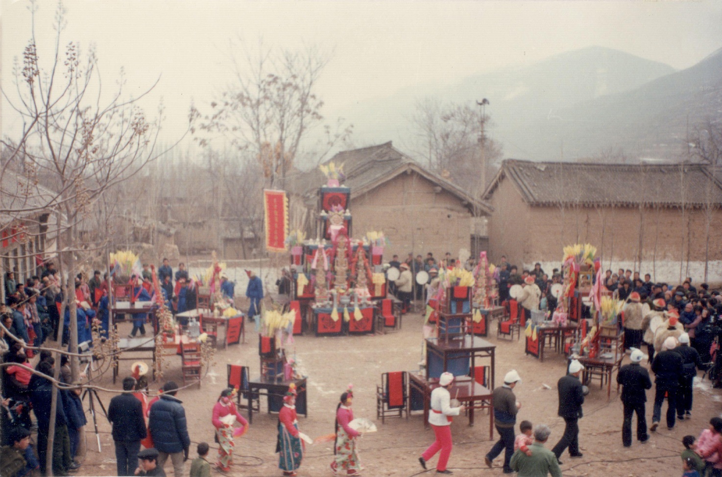 74-1990年 4⽉ 6⽇,任庄村⺠为中国傩戏学国际学术讨论会表演《扇⿎神谱》的盛况(张芳森摄影)