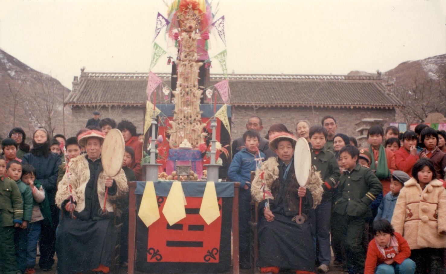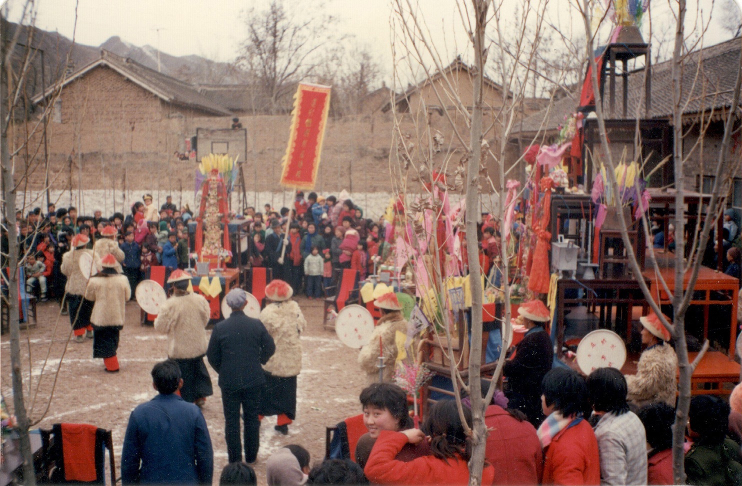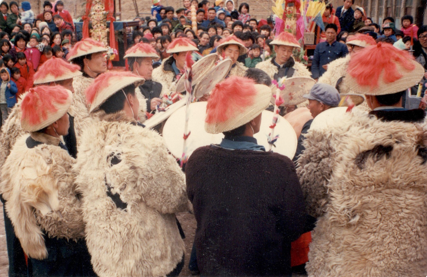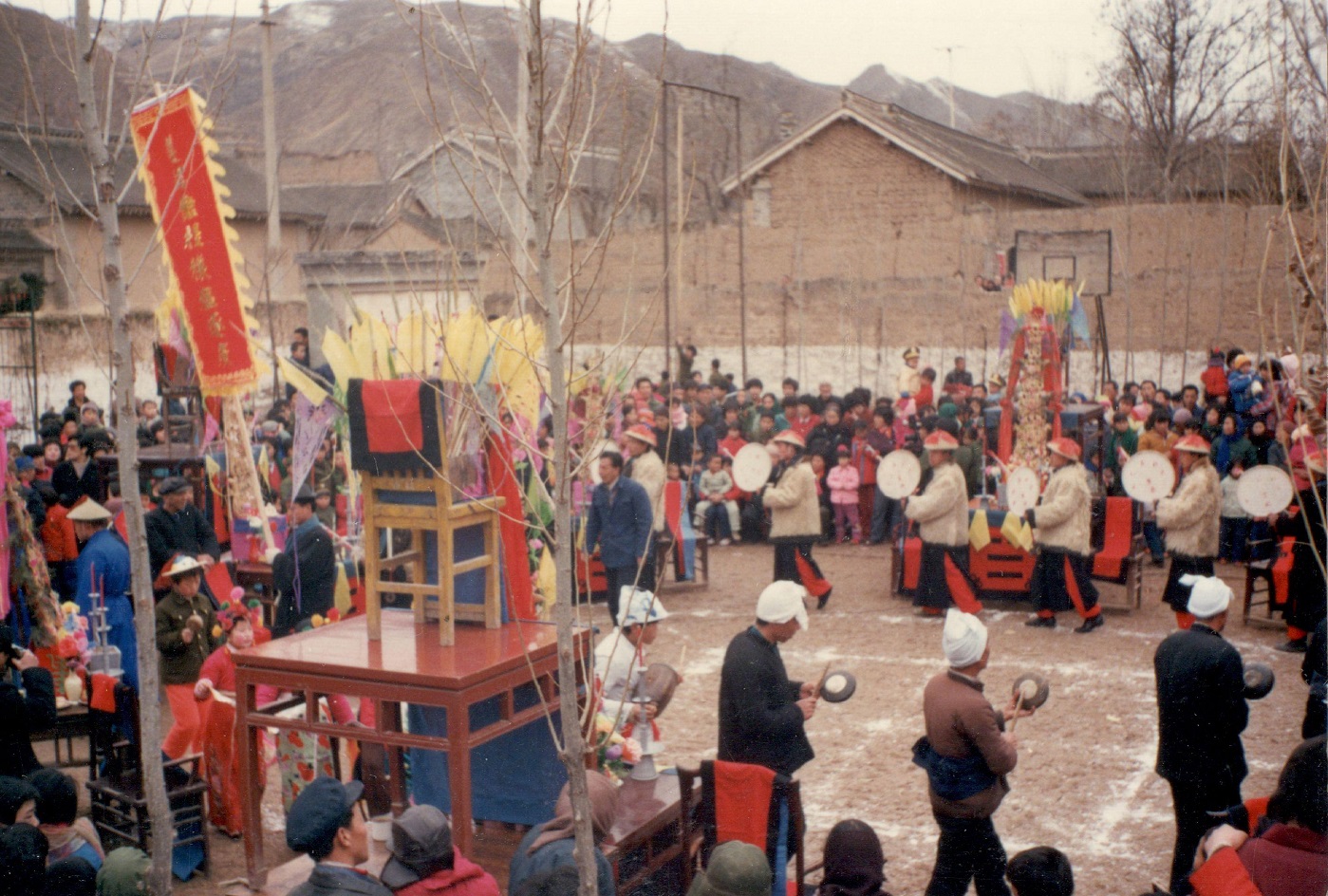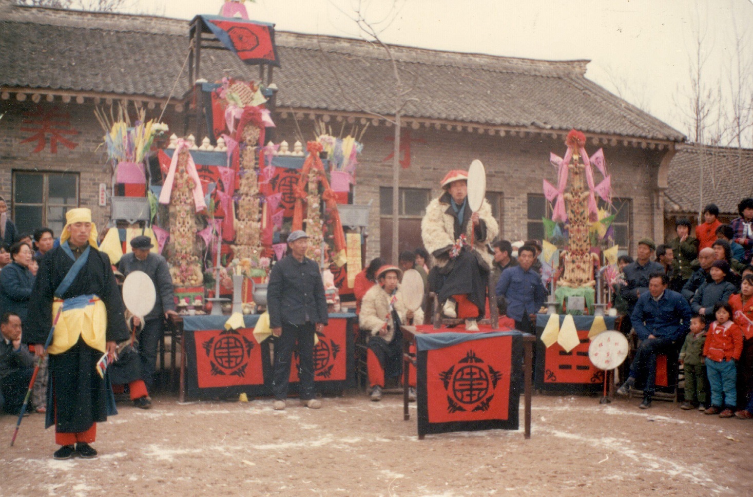 74-1990年 4⽉ 6⽇,任庄村⺠为中国傩戏学国际学术讨论会表演《扇⿎神谱》的盛况(张芳森摄影)