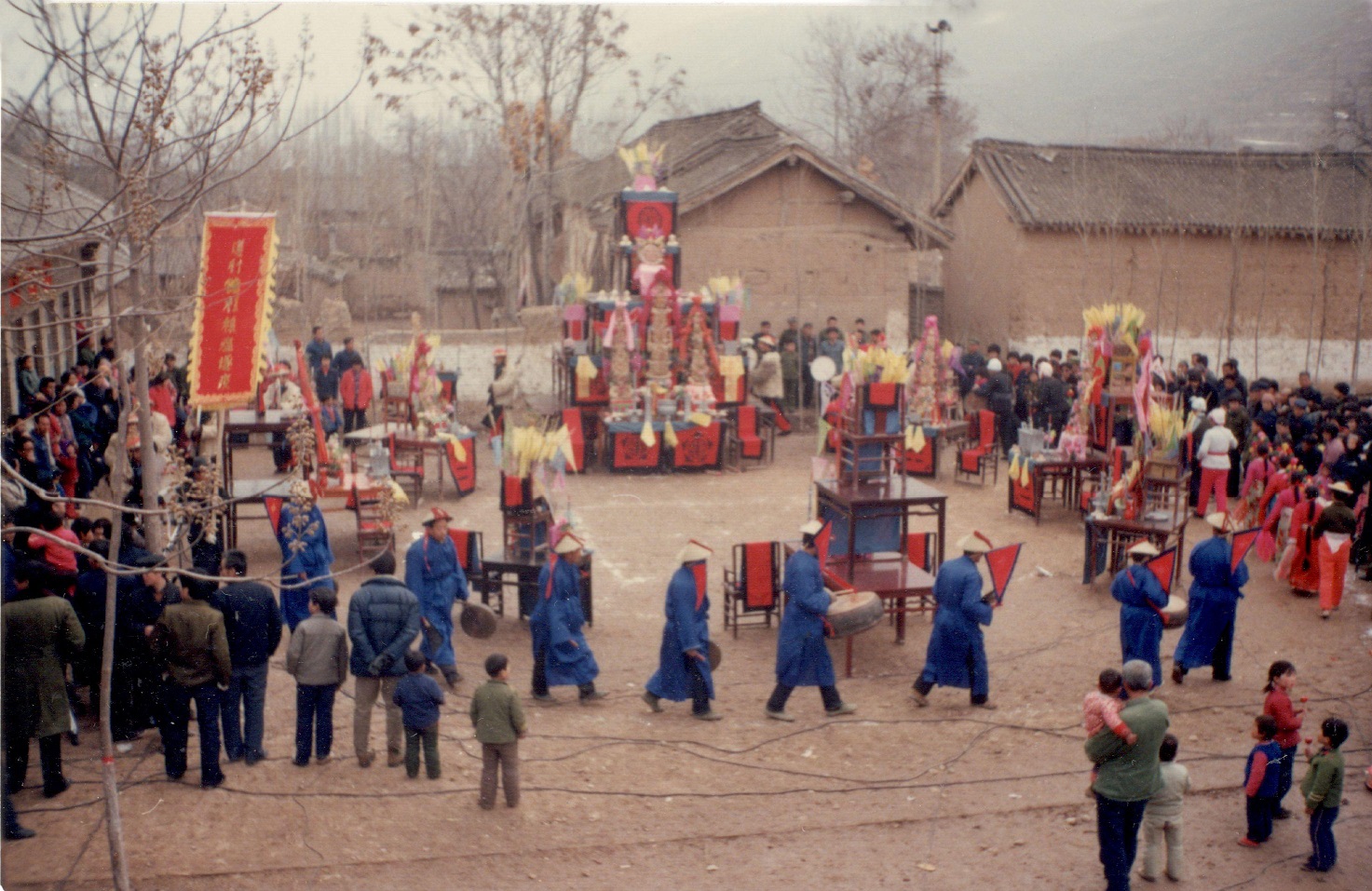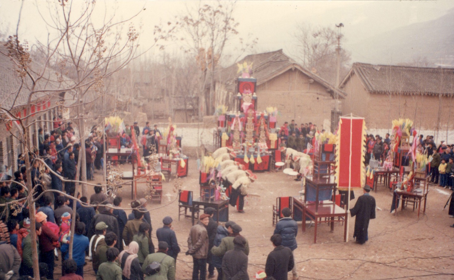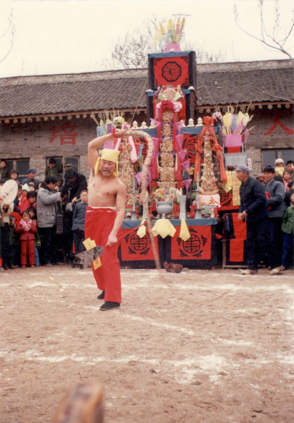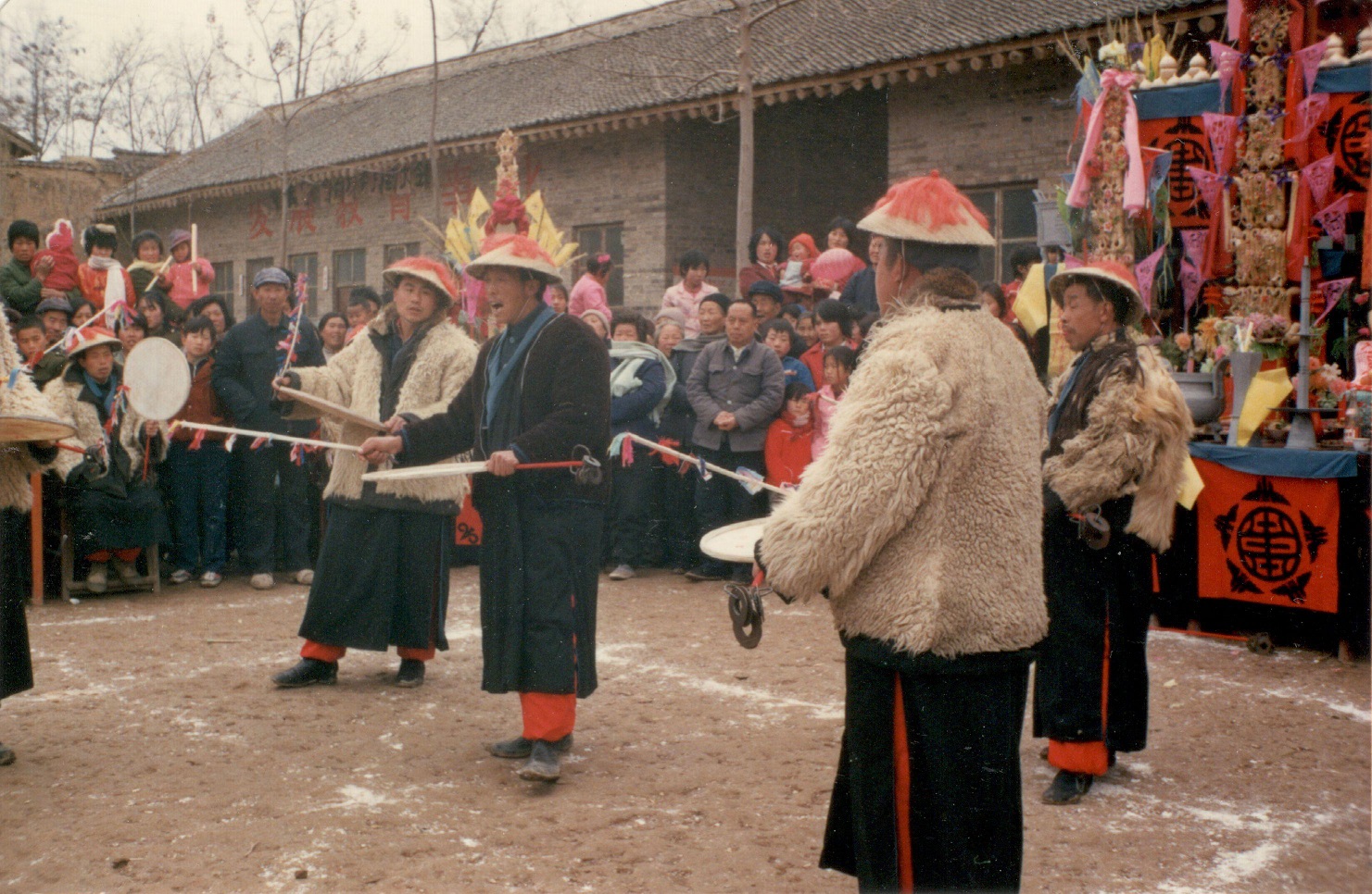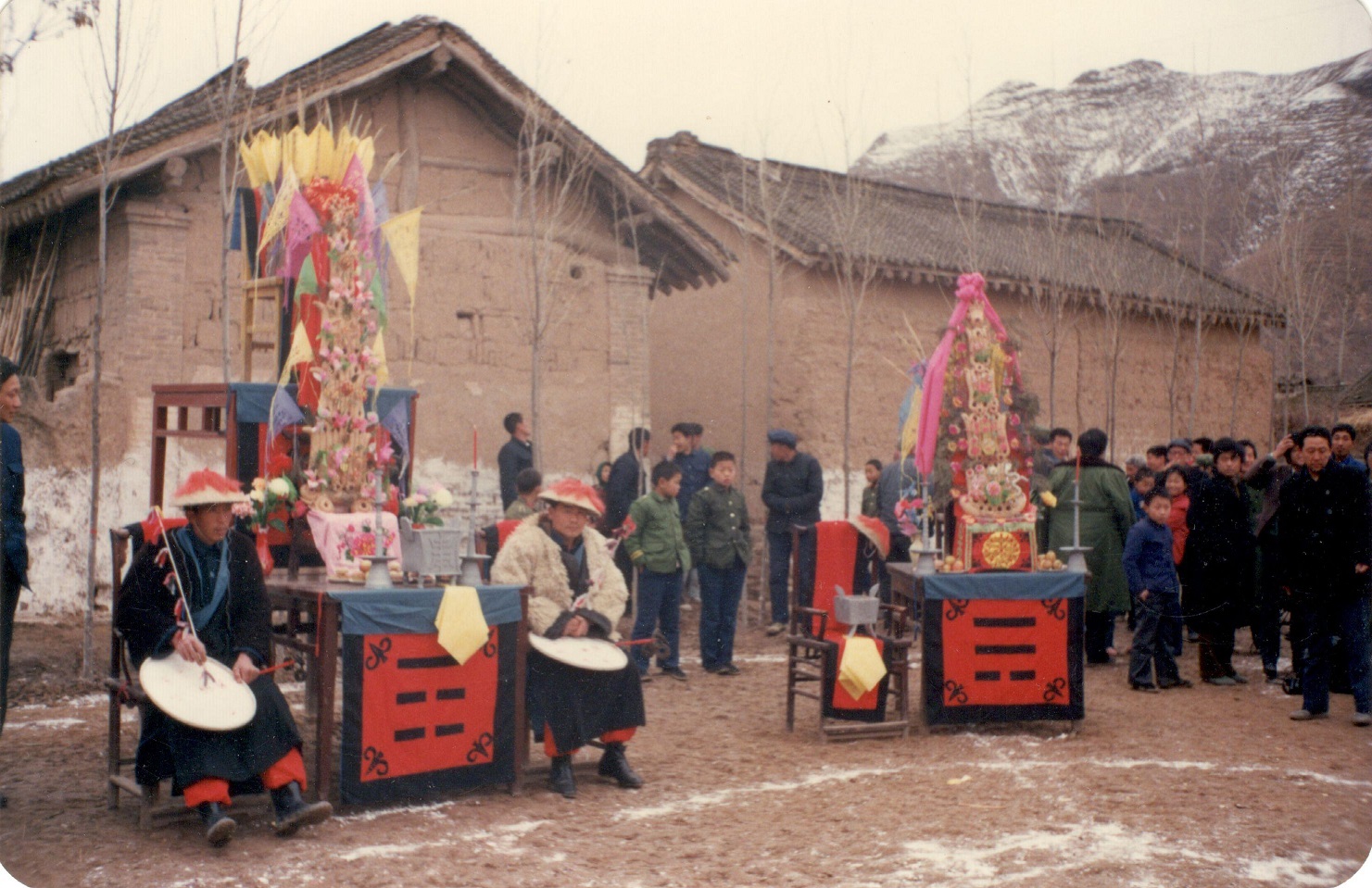 74-1990年 4⽉ 6⽇,任庄村⺠为中国傩戏学国际学术讨论会表演《扇⿎神谱》的盛况(张芳森摄影)