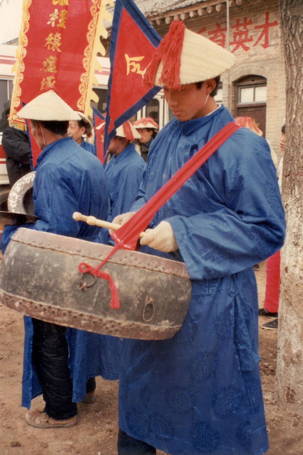 34-⼊坛时绕外三圈的队伍,画⾯前部的是唐代锣⿎队伍
