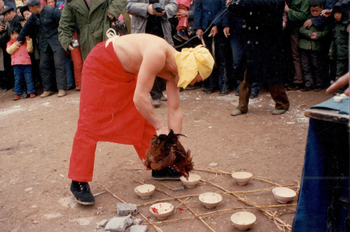 28-划‘七星草“场地,斩草、剁鸡的活动原在北坛桌前的地面上,此次是在校门外东侧的一块空地上进行的
