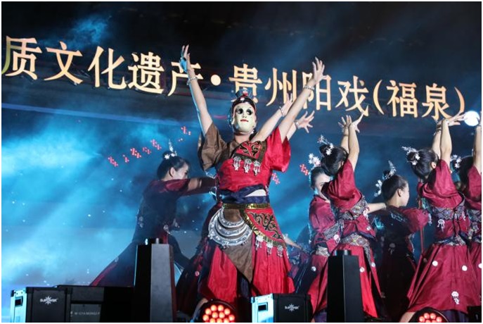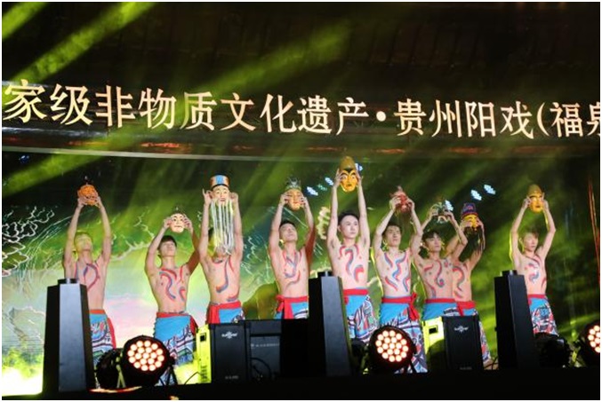 开幕式文艺演出呈现了多个带有阳戏元素(面具、唱腔、服饰等)的创编节目,包括开场节目《傩耀戏乡》、阳戏舞蹈《苗岭傩魂》、阳戏剧目《孟良盗宝》、说唱《阳戏说唱新时代》、男子群舞《追傩》、阳戏展示秀《傩·面》等。