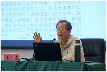 王勇以《遗世奇珍、文化瑰宝──昭通端公戏保护传承和发展的当代思考》为题进行讲授。分别就昭通端公戏的历史渊源、传承发展、表演形态、存在问题和发展建议进行了详细讲解。王勇认为,昭通端公戏具有“外生土长”的特点,是随着历史上汉族移民的足迹传到昭通,呈现出来源广泛、多元并存状态。