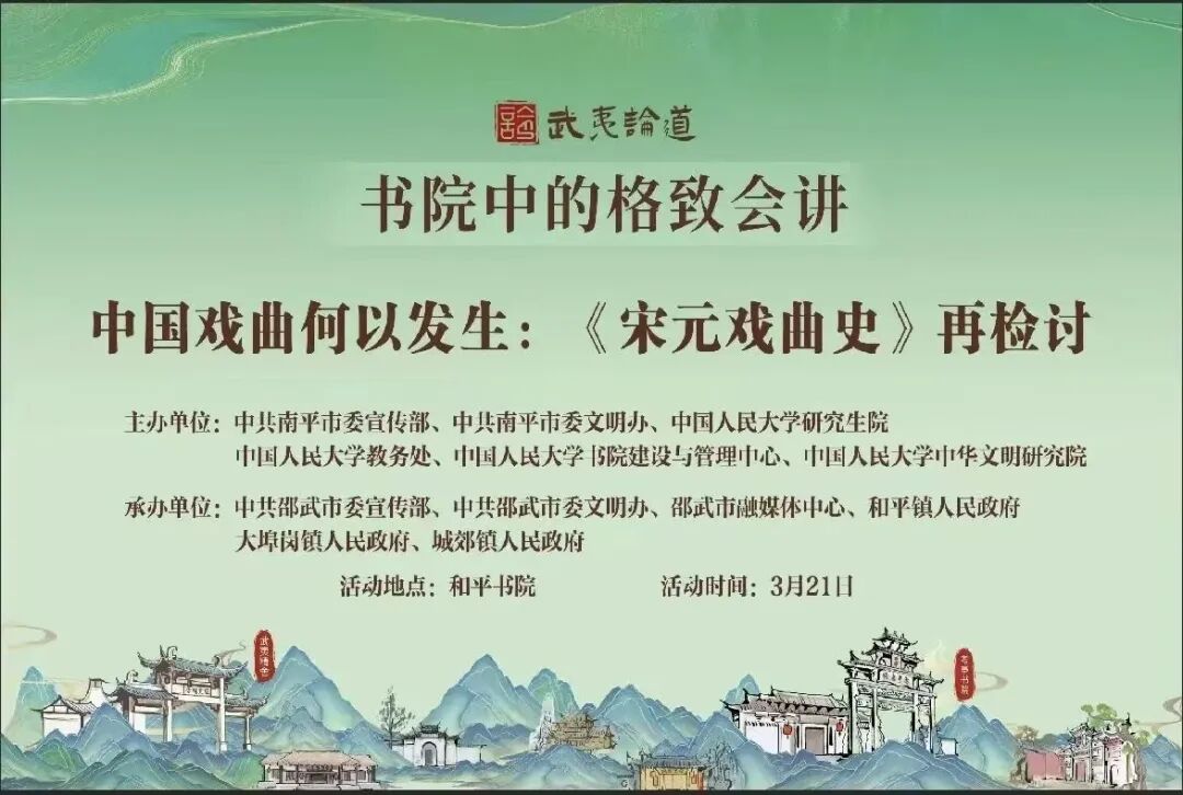 2026年3月21日,由中国人民大学和中共南平市委、南平市人民政府、武夷学院联合主办的第三届“武夷论坛”迎来四方宾朋,共同探讨“中国特色社会主义文化与中华优秀传统文化传承发展”。本次论坛期间,新增设“武夷论道:书院中的格致会讲”环节,邀请清华、北大、韩国成均馆大学等22所国内外顶尖高校200余名学子,在南平十所传统书院空间,展开“殷周之变”“战国文字”“唐宋变革”“朱熹之学”“戏曲考原”等十个主题的会讲。其中,中国人民大学戏剧影视教研室统筹组织了在邵武和平书院举行的“中国戏曲何以发生:《宋元戏曲史》再检讨”分会场。由熊之莺老师带队的南京大学团队和张婷婷老师带队的上海大学团队共22名师生,应邀参与本场论道。同时,邵武傩舞和稀有剧种三角戏的非遗传承人也全程旁听了为期一天的论道会讲。