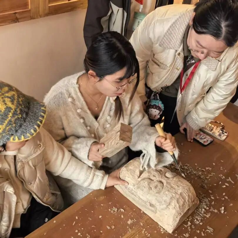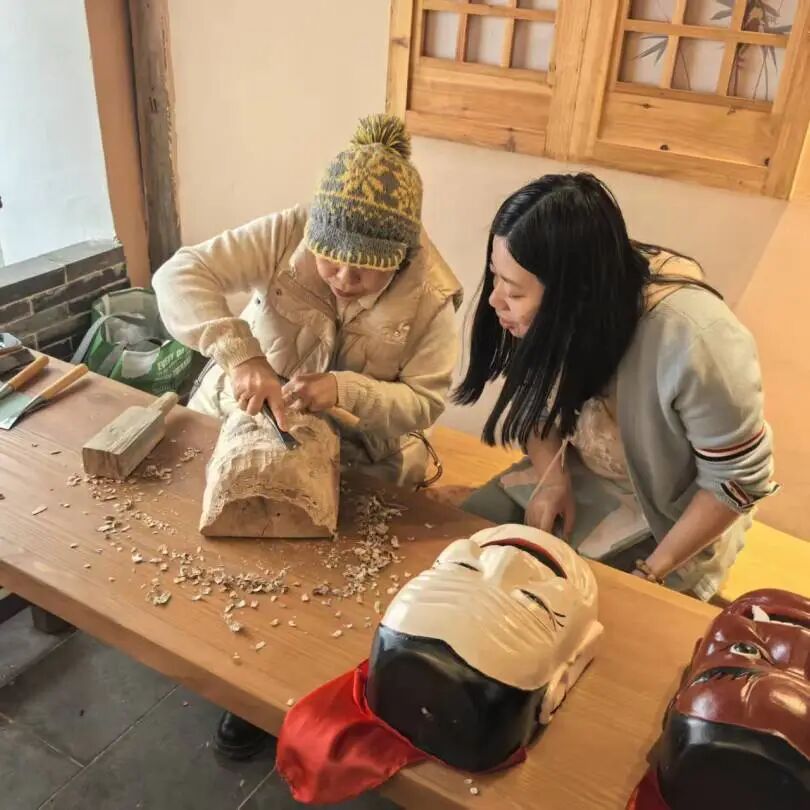 在面具雕刻工作室内,黄老师拿出了邵武傩舞中最具代表性的开路神和弥勒面具,前者是邵武众多傩舞节目中的前导,负责驱妖赶鬼,敲锏开道;后者常出现在邵武傩舞《跳番僧》中,叶明生等学者认为体现了当地傩舞的弥勒信仰。同学们争相戴上傩舞面具,并在雕刻师黄美凤老师手把手的指导下,兴致勃勃体验了傩舞面具的传统雕工。