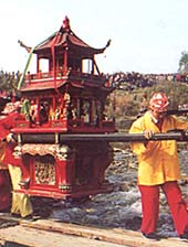 在傩戏集中的刘街乡,每年正月十五都要举行朝青山庙活动。其朝庙仪仗十分壮观,除有全副锡制銮驾、香盘、吊炉和十番锣鼓、龙灯、狮子灯外,还有几个人高举的特制大旗,10公斤重的大铁铳,筛子大小的开锣,用无数锦缎所绣莲花瓣缀成的“百代伞”和用稀有罗汉竹制作的“扎板”。朝庙队伍浩浩荡荡,绵延数里,各村社的队伍异彩纷呈。当地民谚有“南边旗,荡里伞,刘锣戴铳汪扎板,山里山外光呐喊”的词句,以形容其仪仗各具特色和丰富多彩。